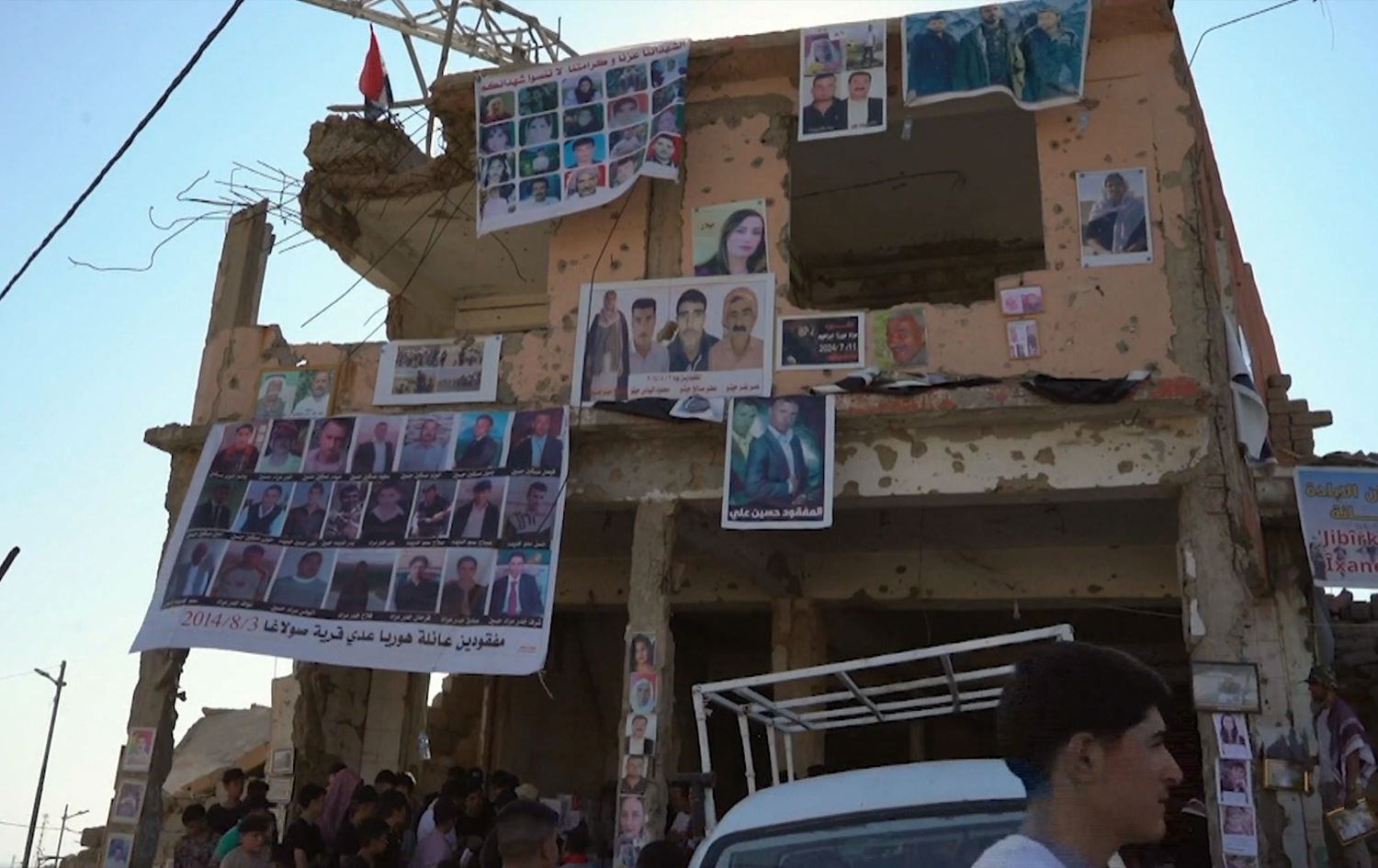 وێنەى ئەوانەى بەدەستى داعش کوژران و یان بێسەروشوێنن، بە دیواری ئەو خانوو و باڵەخانەدا هەڵواسراون، کە هێشتا وێرانەن.