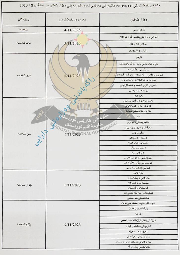 وەزارەتی دارایی و ئابووریی هەرێمی کوردستان خشتەی دابەشکردنی مووچەی فەرمانبەران و مووچەخۆرانی هەرێمی کوردستانی بڵاوکردەوە کە رۆژی شەممە، 4-11 دەستپێدەکات و 9-11 کۆتایی دێت.