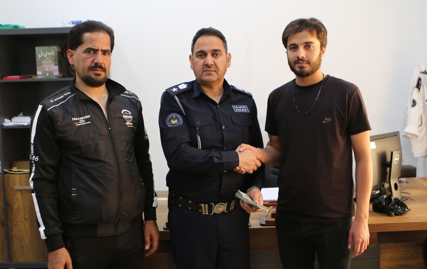 لە راستەوە، ئەو کەسەی پارەکەی دۆزیوەتەوە، ئەفسەرێکی هاتووچۆی سلێمانی و ئەو هاووڵاتییەی پارەکەی ونکردبوو.