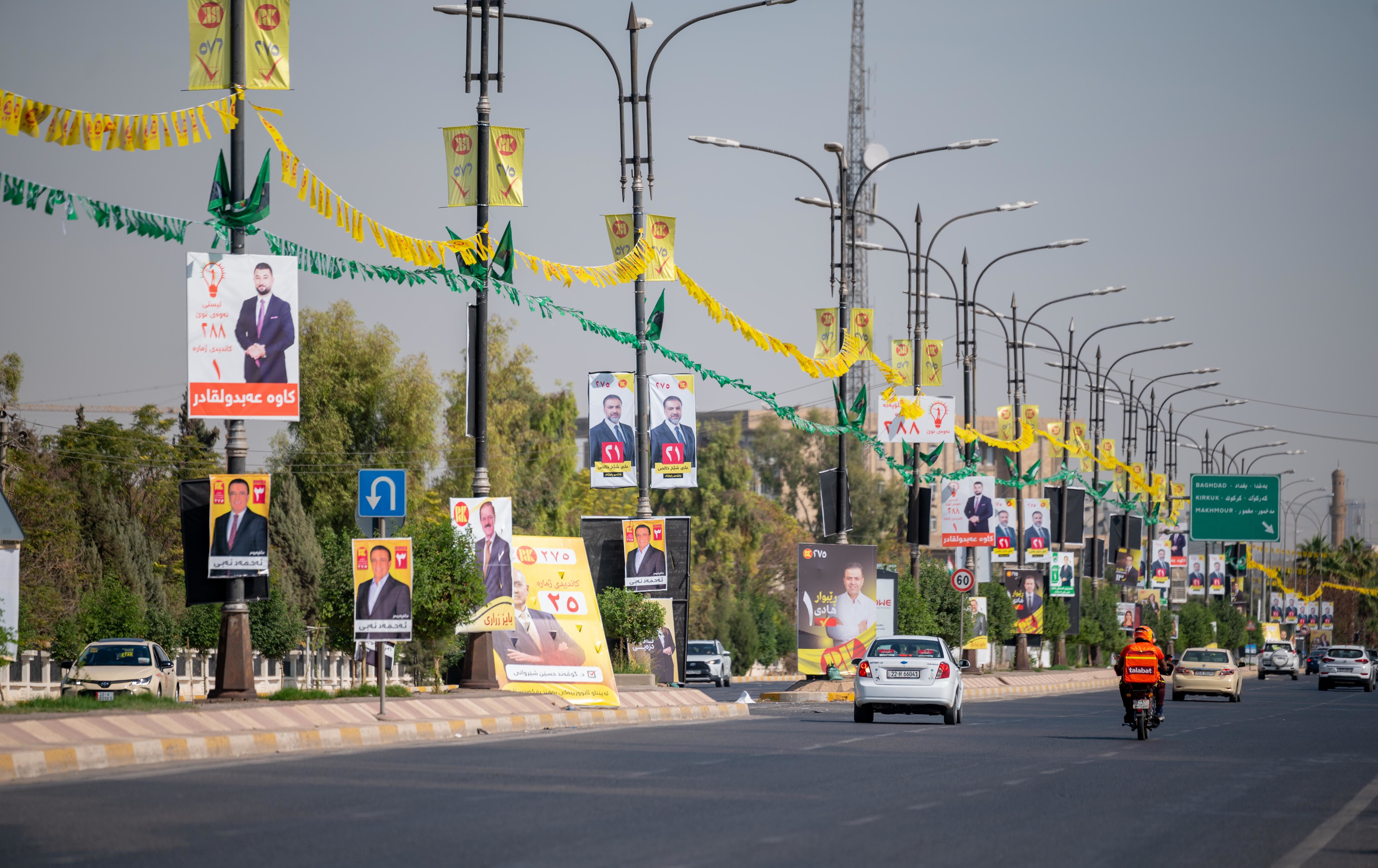 وێنەی ئاڵا و فلێکسی لایەنە جیاوازەکان لە شەقامێکی هەرێمی کوردستان بۆ هەڵبژاردنی پەرلەمانی عێراق 2025. وێنە: بڵند تاهیر - رووداو.