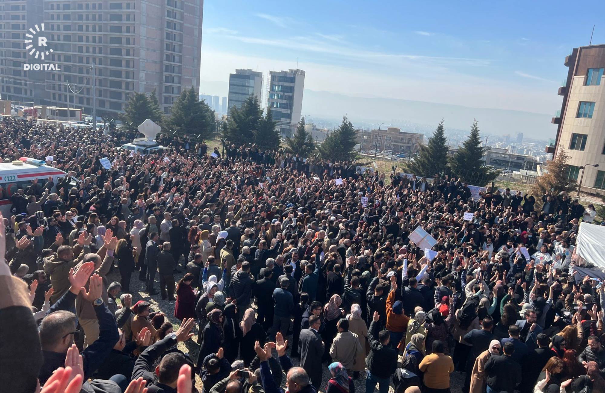 حەوت رۆژە ژمارەیەک مامۆستا و فەرمانبەر دژی پێنەدانی ماف و شایستەداراییەکانیان لە سلێمانی مانیان لە خواردن گرتووە، ئەمڕۆ دووشەممەش ژمارەیەکی زۆر لە مامۆستا و فەرمانبەران لە ناوچە جیاوازەکانی پارێزگای سلێمانییەوە چوونە بەردەم خێوەتەکەیان و خۆپێشاندانیان کرد.