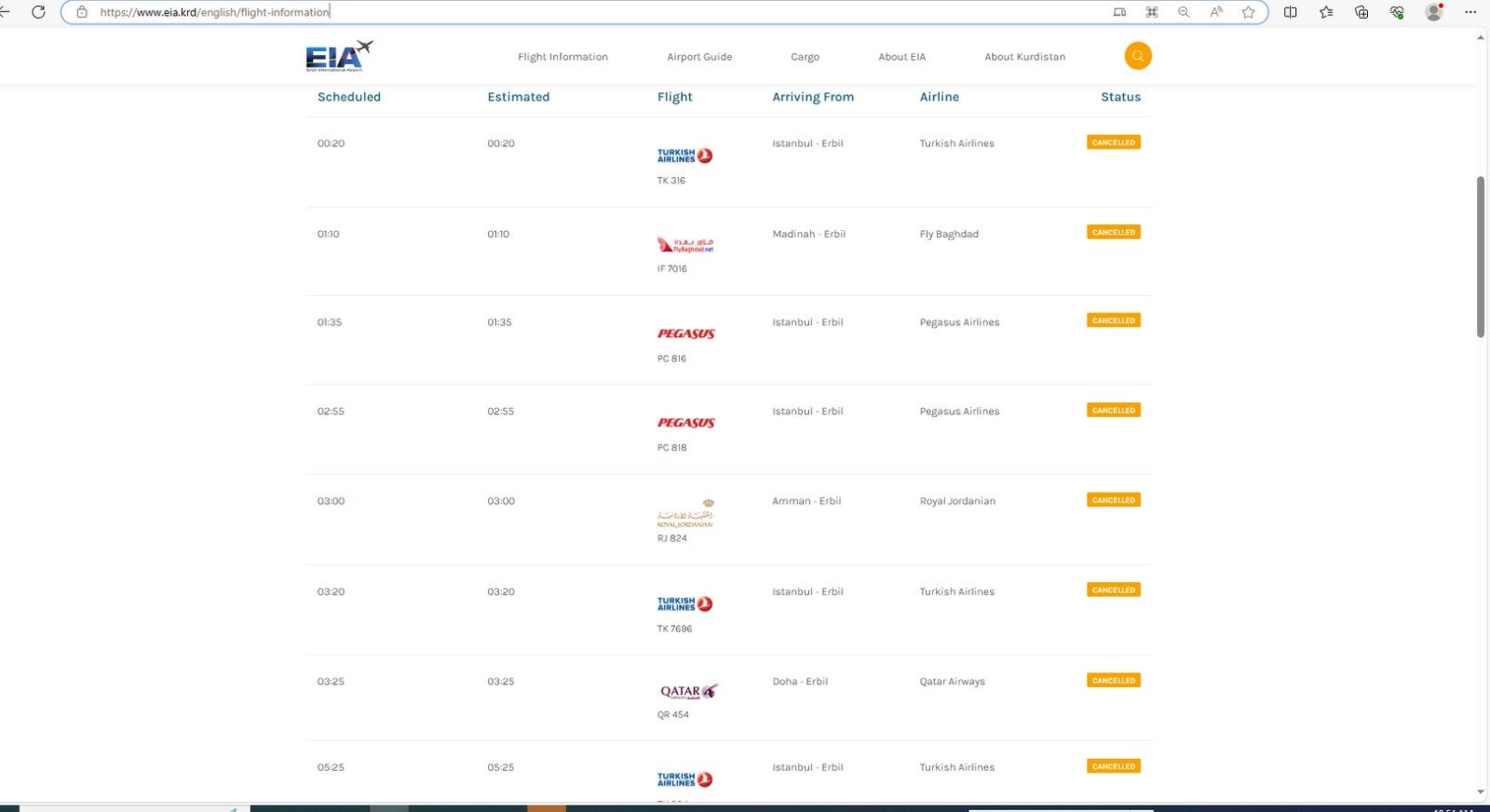 لە ماڵپەڕی فڕۆکەخانەی نێودەوڵەتیی هەولێر گەشتەکانی هاتن لە ئیستەنبووڵەوە لە کاژێرەکانی 00:20 و 01:35 و02:55 و 03:20 و05:25، مەدینە 01:10، عەمان 03:00 و دۆحە 03:35 هەڵوەشاونەتەوە.