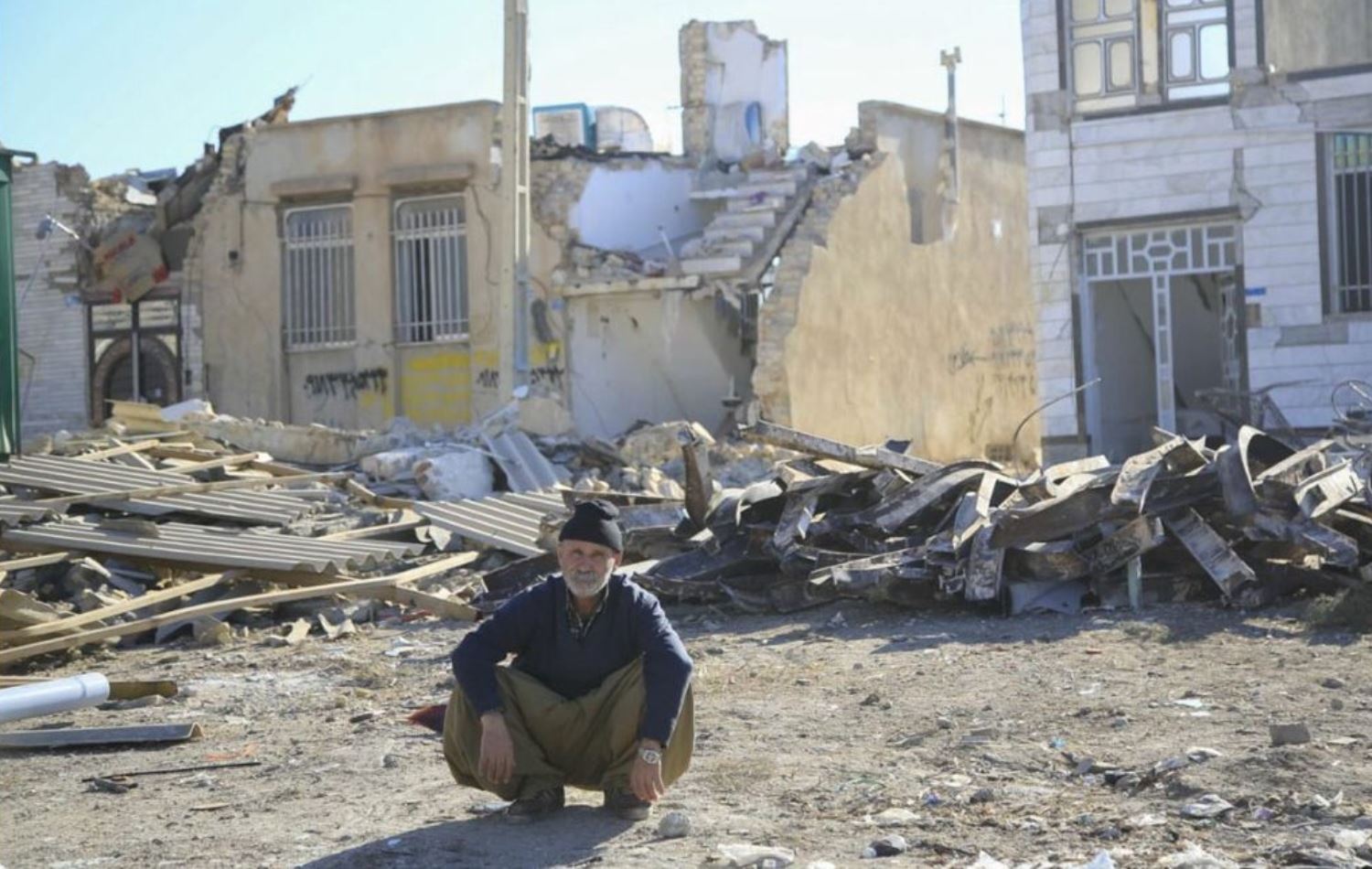 هاونیشتمانییەک لەبەردەم ماڵە رووخاوەکەیدا لە ساڵی 2017، کە بەهۆی بوومەلەرزەیەک بە گوڕی 7.3 پلەی رێختەر، وێران ببوو