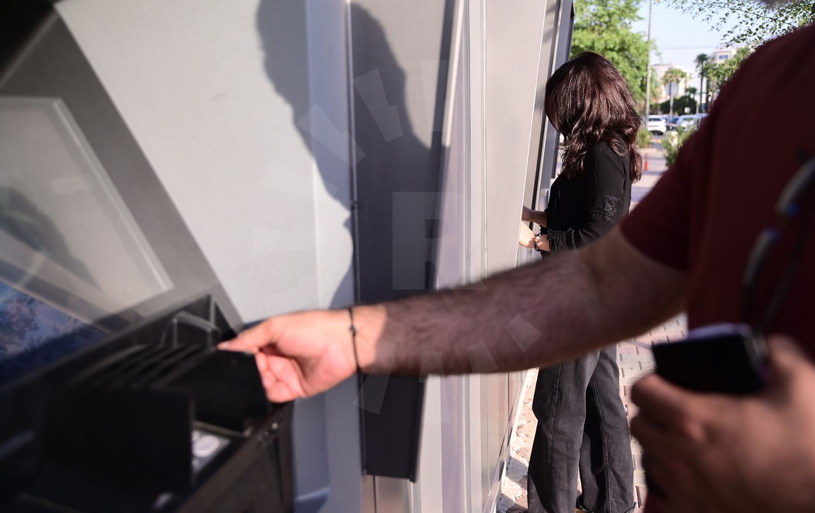 دوو مووچەخۆر لە ئامێرەکانی راکێشانی پارەی پڕۆژەی هەژماری من مووچە وەردەگرن. وێنە: بڵند تاهیر - رووداو