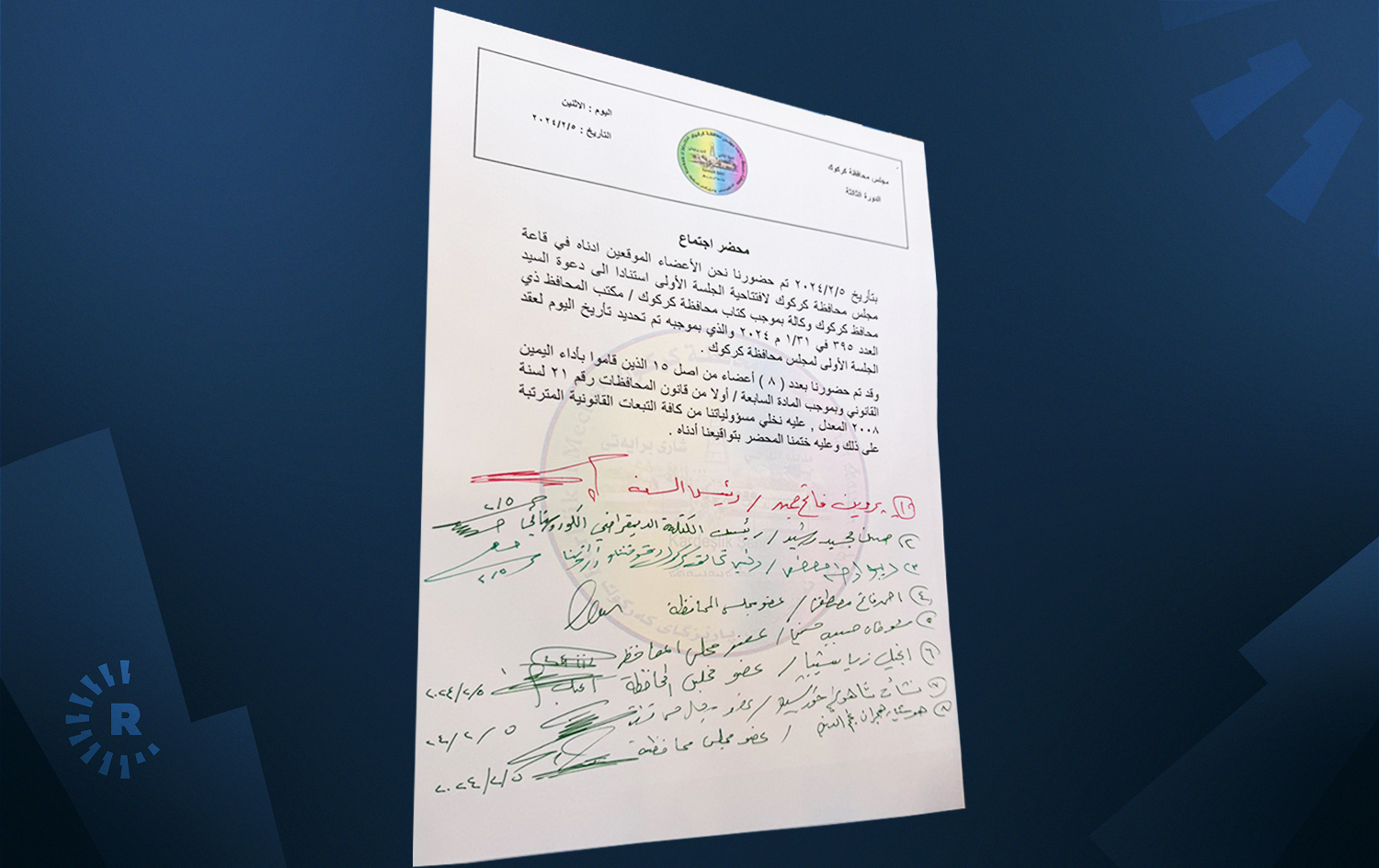 راکان جبووری، پارێزگاری کەرکووک بە وەکالەت رۆژی 5ـی شوباتی دیاریکردبوو بۆ یەکەم دانیشتنی ئەنجوومەنی پارێزگای کەرکووک و نامەی فەرمی بۆ سەرجەم ئەندامانی تازە هەڵبژێردراوی ئەنجوومەنەکە ناردبوو. رێبوار تەها دەڵێت، "فراکسیۆنی پارتی دیموکراتی کوردستان، نوێنەری مەسیحییەکان و هاوپەیمانیی کەرکووک هێز و ئیرادەمانە ئامادەی کۆبوونەوەکە بووین".