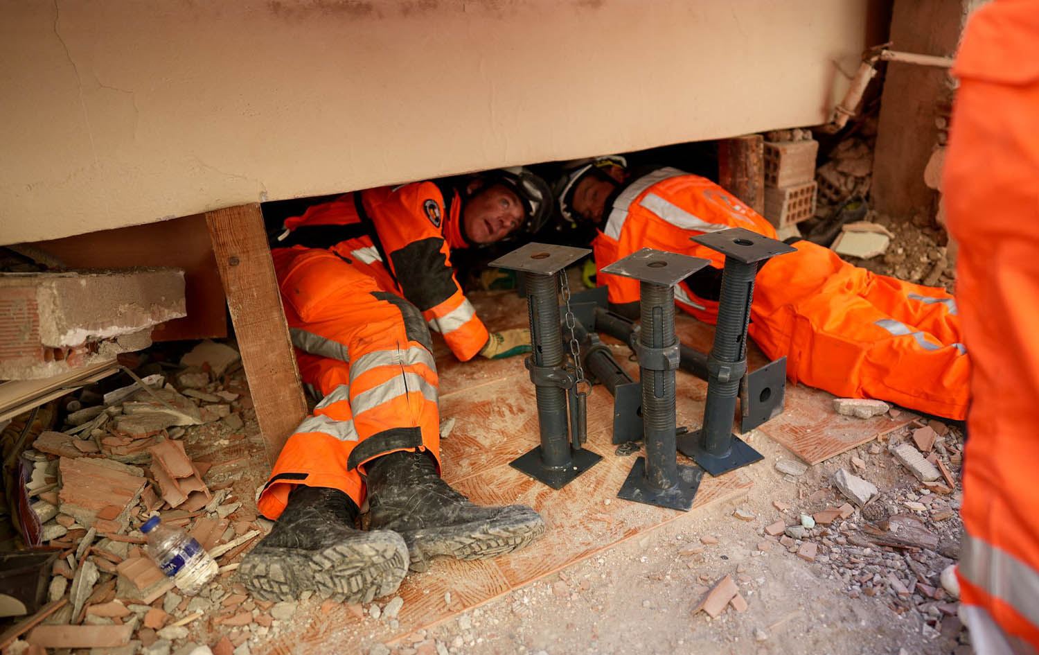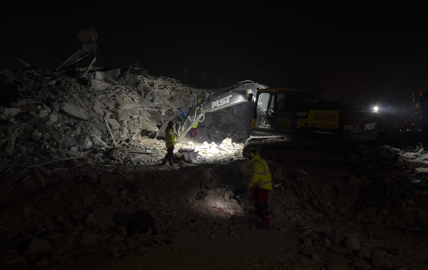 ئەندامانی تیمێکی رزگارکردن بێدەنگ بوون و گوێ دەگرن بۆ بیستنی دەنگی ئەوانەی لەژێر داروپەردووی باڵەخانەیەک. وێنە: رووداو