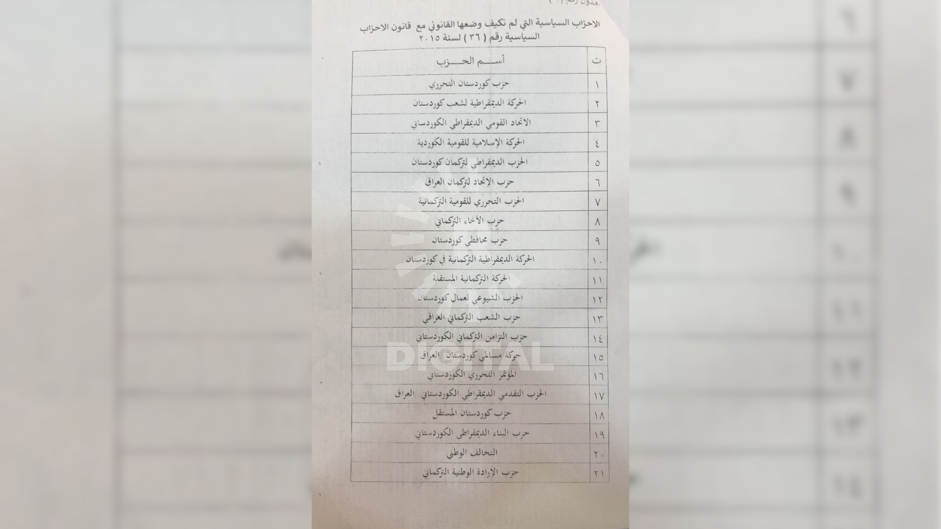 ئەو پارتانەی لە فەرمانگەی پارت و رێکخراوەکان لە کۆمیسیۆنی باڵای سەربەخۆی هەڵبژاردنەکانی عێراق تۆمارکراون: