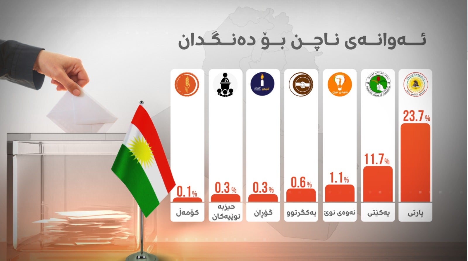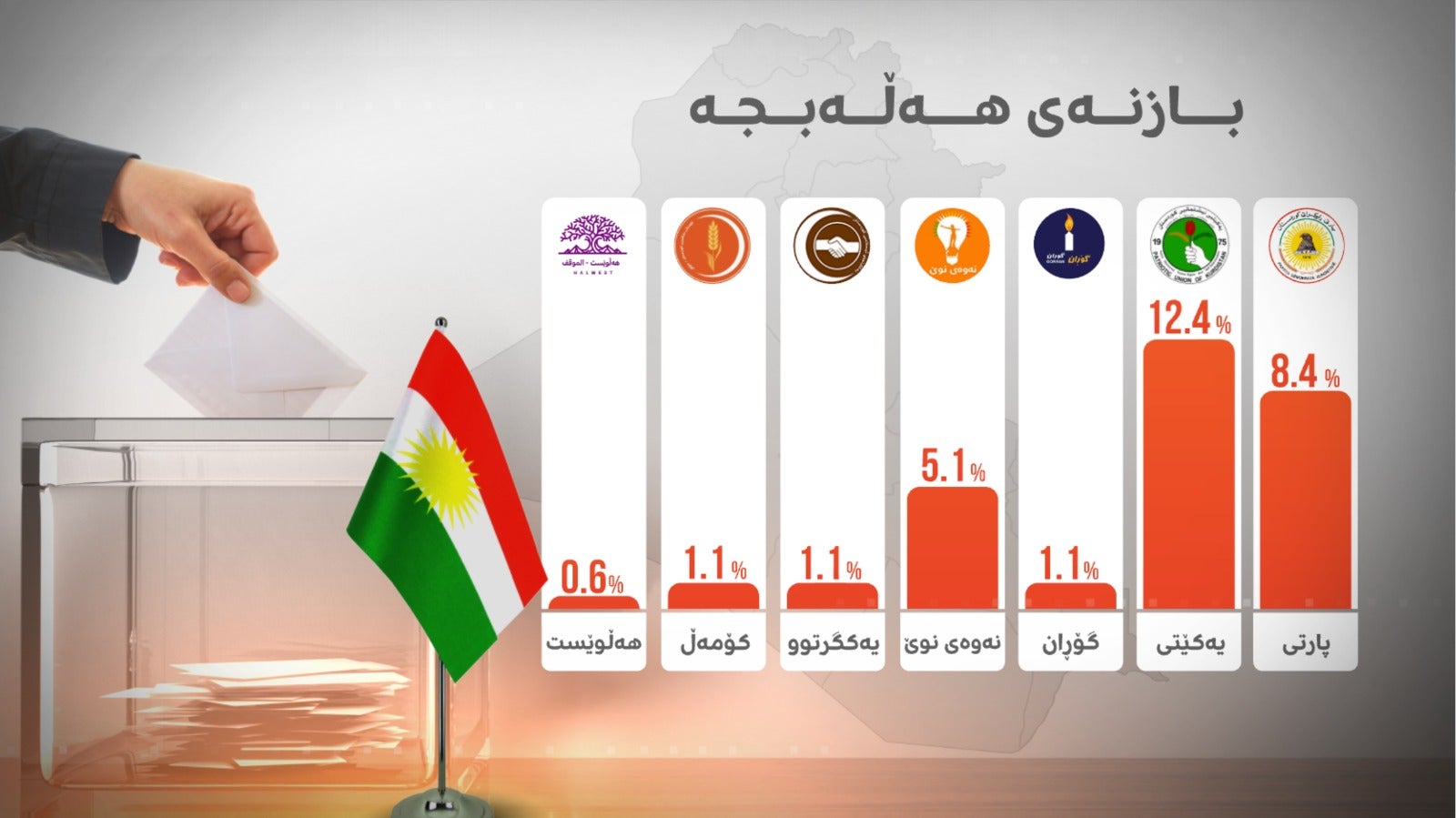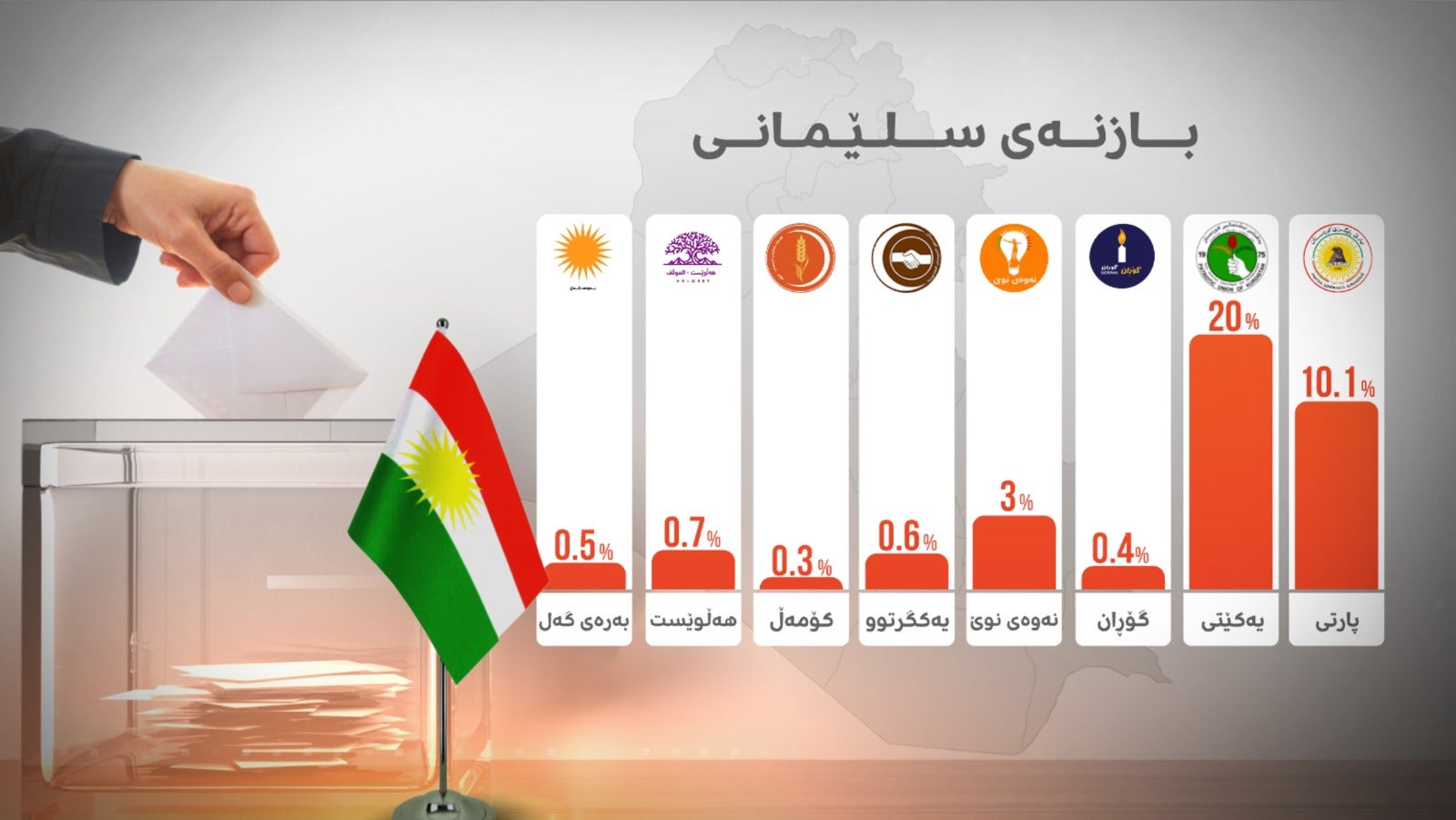 8.4٪ بۆ پارتی، 12.4٪ بۆ یەکێتی، 1.1٪ بۆ گۆڕان، 5.1٪ بۆ نەوەی نوێ، 1.1٪ بۆ یەکگرتوو، 1.1٪ بۆ کۆمەڵ و 0.6٪ بۆ رەوتی هەڵوێست پێشبینیکراون.