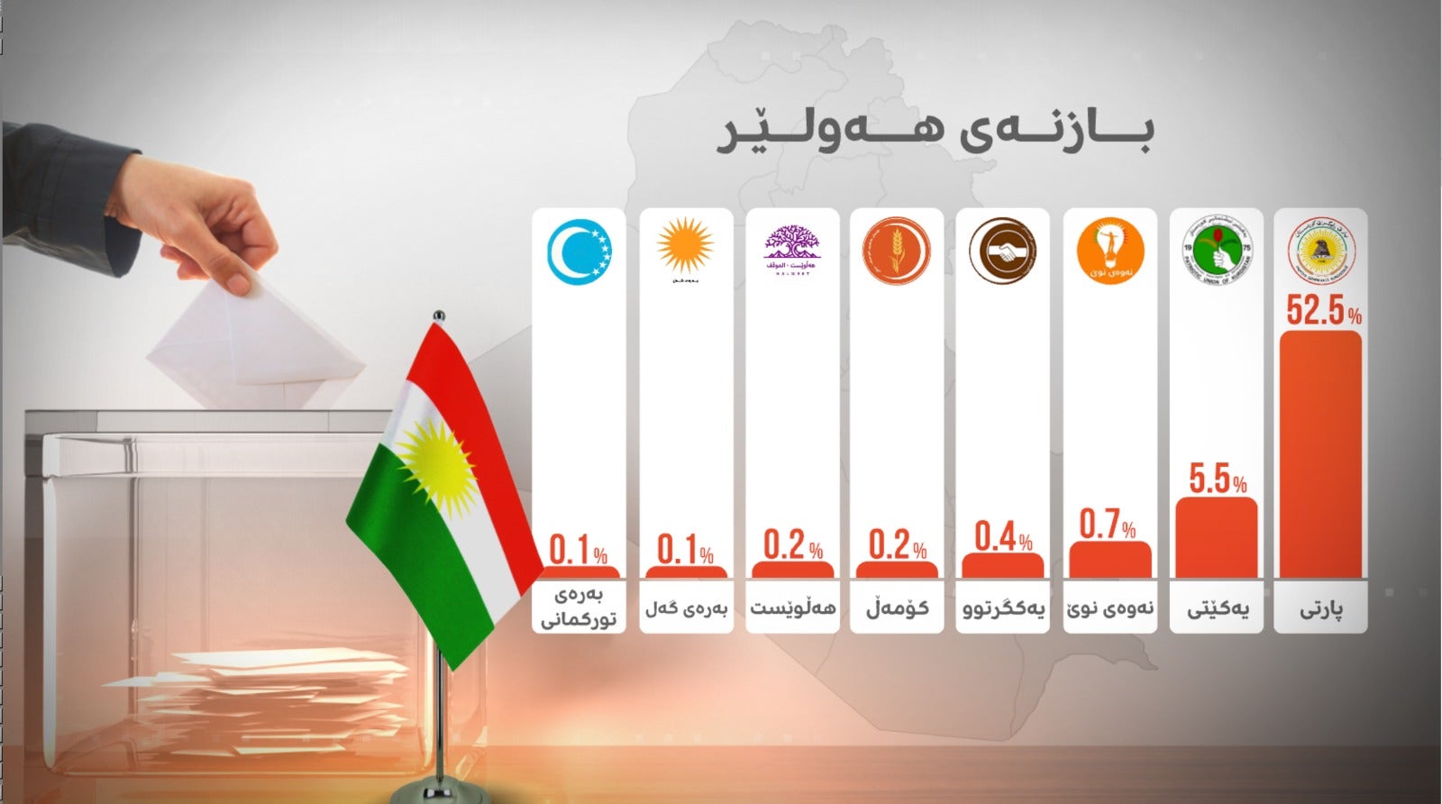 پارتی دیموکراتی کوردستان 10.1٪، یەکێتیی نیشتمانیی کوردستان 20٪، جوڵانەوەی نەوەی نوێ 3٪، یەکگرتووی ئیسلامی 0.6٪، کۆمەڵی دادگەری 0.3٪، بزووتنەوەی گۆڕان 0.4٪، رەوتی هەڵوێست 0.7٪ و بەرەی گەل 0.5٪ دەنگەکانی ئەو پارێزگایە بەدەستدەهێنن.