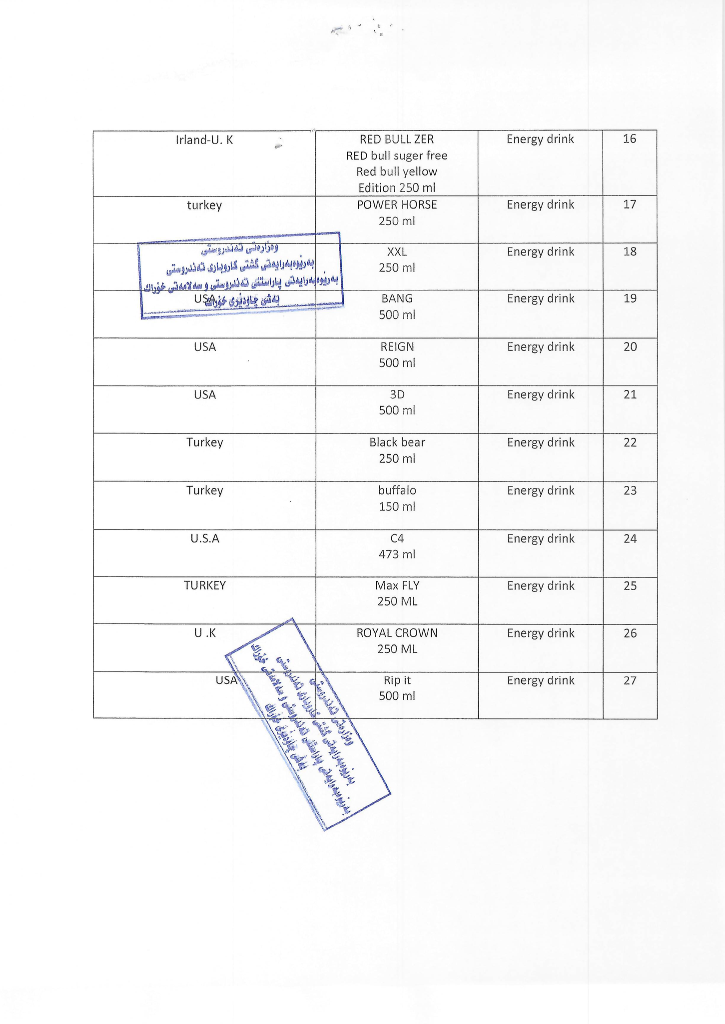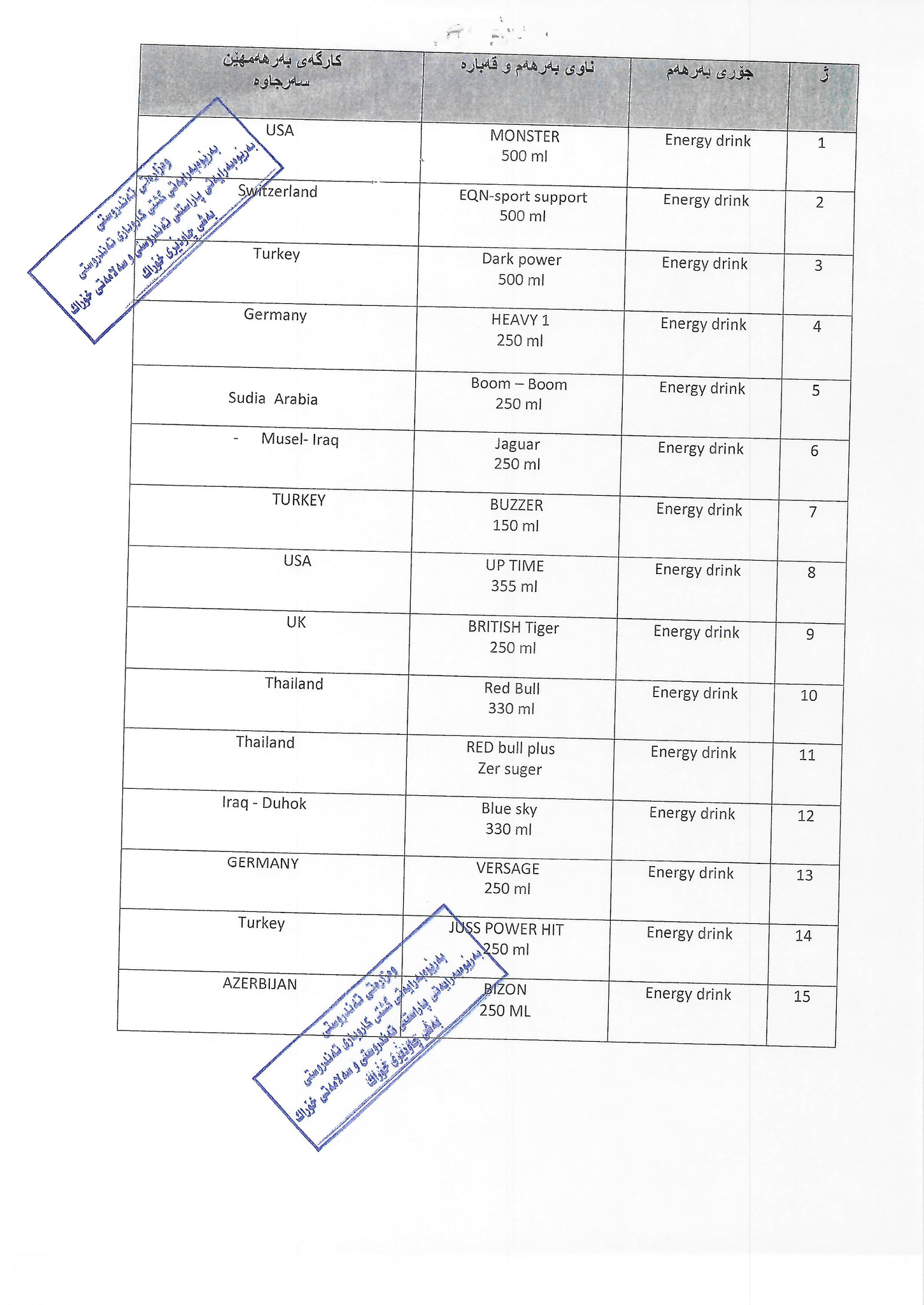 ئەو شیر و وزەبەخشانەی وەزارەتی تەندروستیی هەرێمی کوردستان قەدەخەی کردوون، بەرهەمهێندراوی چەندین وڵاتن لەوانە: (ئێرلەندا، ئەمریکا، بەریتانیا، سویسرا، ڤێتنام، هۆڵەندا، تورکیا، ئەڵمانیا، سعودیە، عێراق، تایلەند، هەرێمی کوردستان-دهۆک و ئازەربایجان).