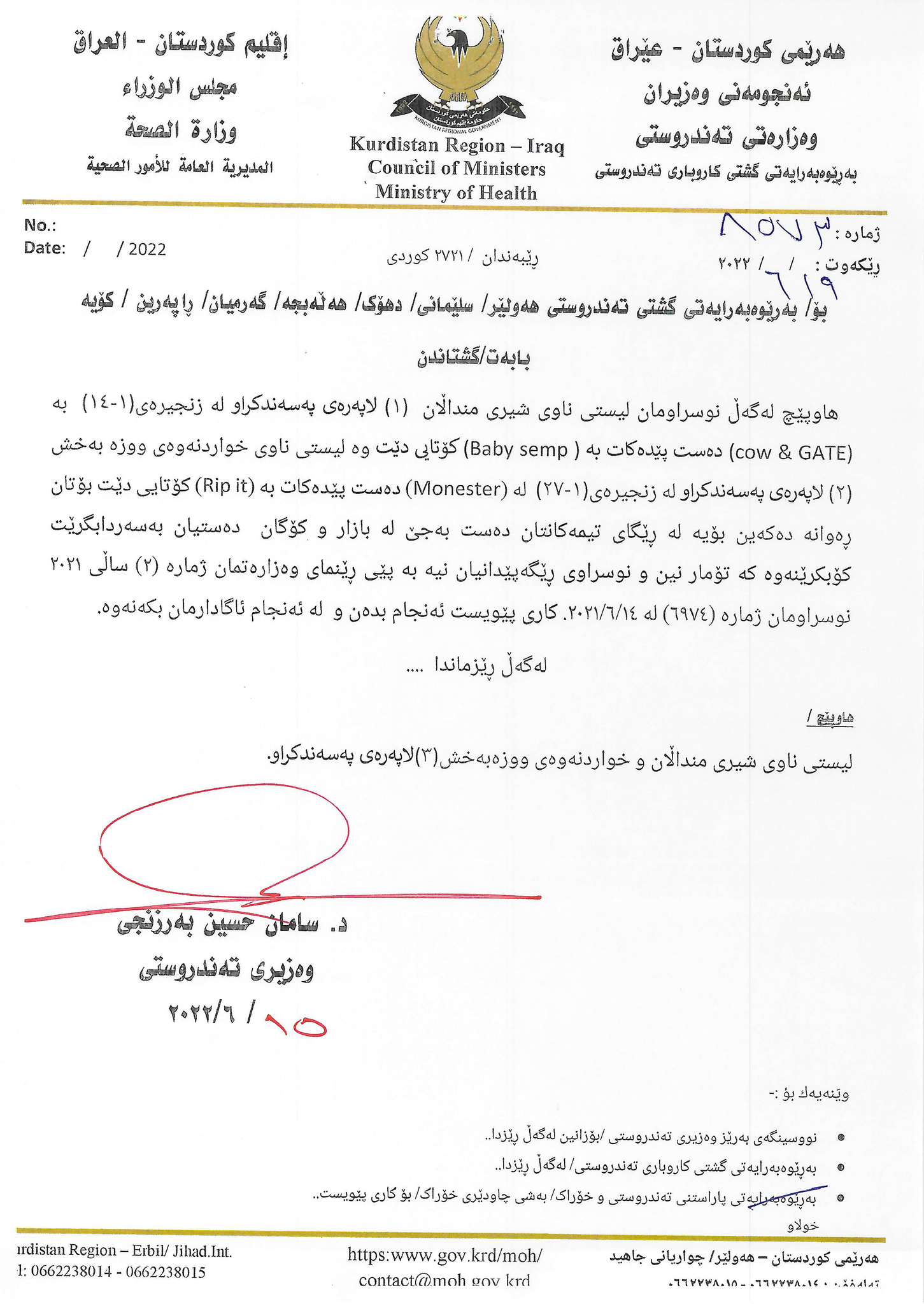 رۆژی چوارشەممە، 6-7-2022، د. كاوە خەلیل، بەڕێوەبەری گشتیی كاروباری تەندروستی لەوەزارەتی تەندروستیی هەرێمی کوردستان بە تۆڕی میدیایی رووداوی راگەیاند: "دوای ئەوەی 36 جۆر شیر و ژمارەیەک وزەبەخشیان دیاریکرد لەوانەی کە رێگەپێدانیان نییە و تۆمارکراو نین، بۆیە ماوەی دوو مانگ مۆڵەتیان دایە ئەو کۆمپانیایانەی ئەو بەرهەمانە دەهێنن بۆ ئەوەی سەردانی وەزارەت بکەن بەمەبەستی هێنانی بەڵگەنامەکانیان، بەڵام بەشێکی کەمیان سەردانی وەزارەتیان کرد، بەڵام ئەوانەی سەردانیان نەکرد، بەرهەمەکانیان قەدەخە کران."