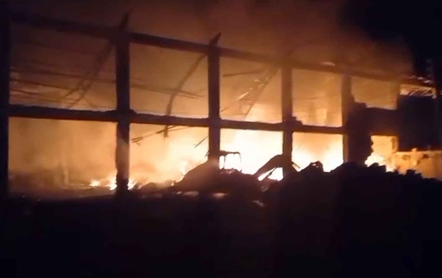 دیمەنی ئاگرکەوتنەوە لە باڵەخانەیەک لەدوای بۆردوومانێکی تورکیا بۆسەر ناوچەیەکی ژێر دەسەڵاتی هەسەدە لە رۆژئاوای کوردستان