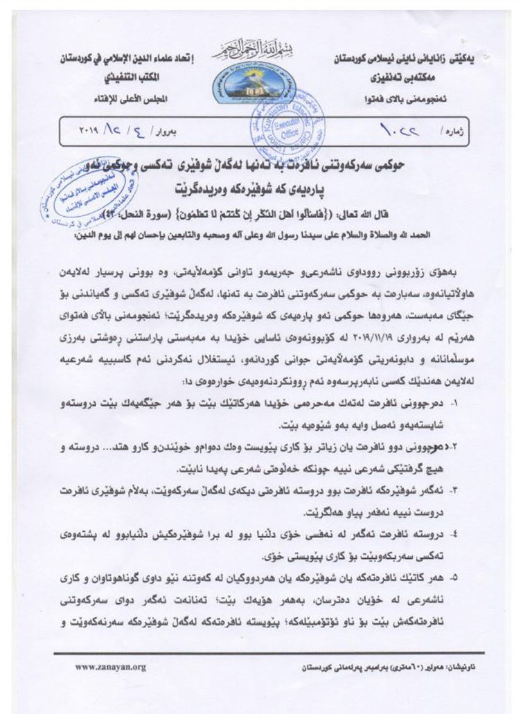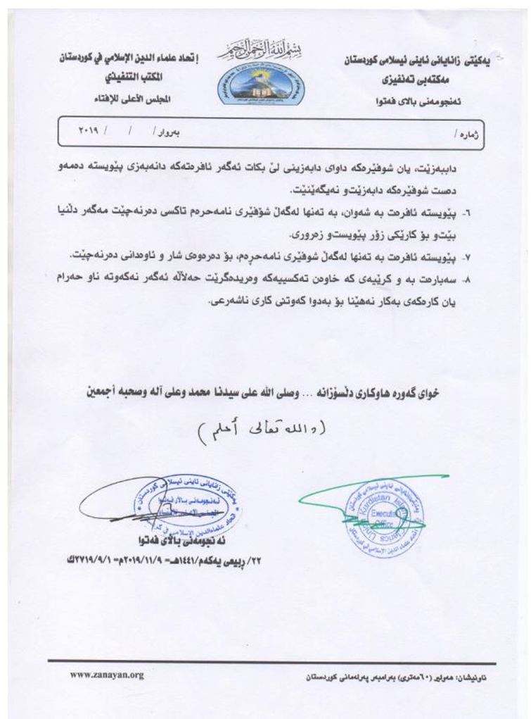 دەقی فەتواکەی یەکێتی زانایانی ئایینی کوردستان
