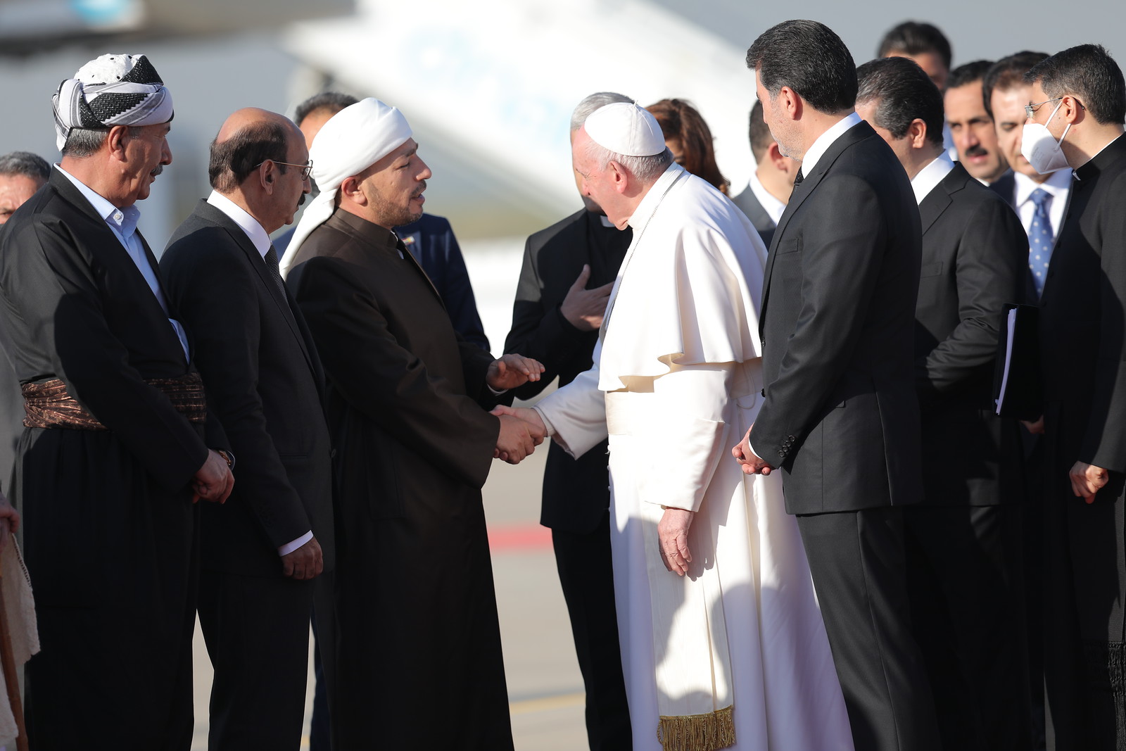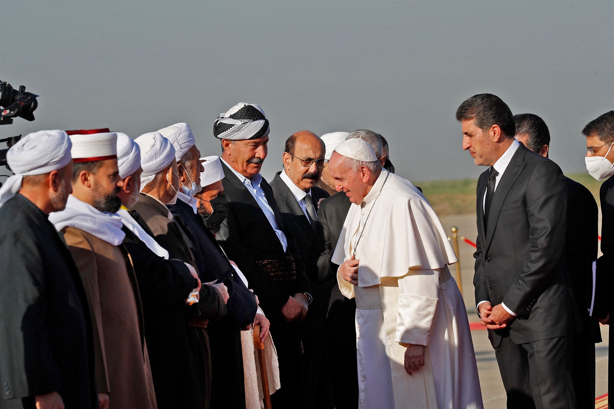 پاپا فرانسیس لە فڕۆکەخانەی هەولێر لەلایەن سەرۆکی هەرێمی کوردستان و سەرۆکی حکومەتی هەرێمی کوردستانەوە پێشوازیی لێدەکرێت. وێنە: Safin Hamed Hamid/AFP