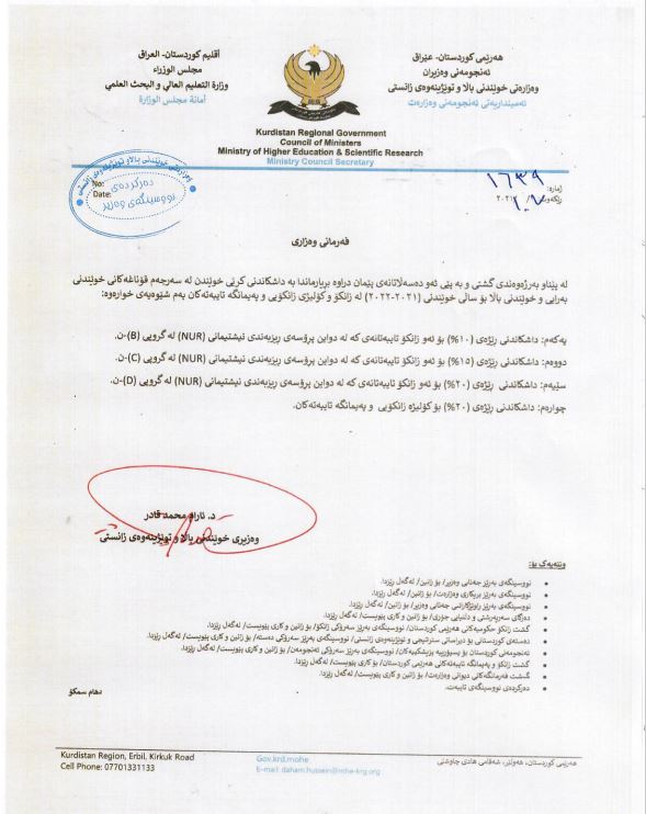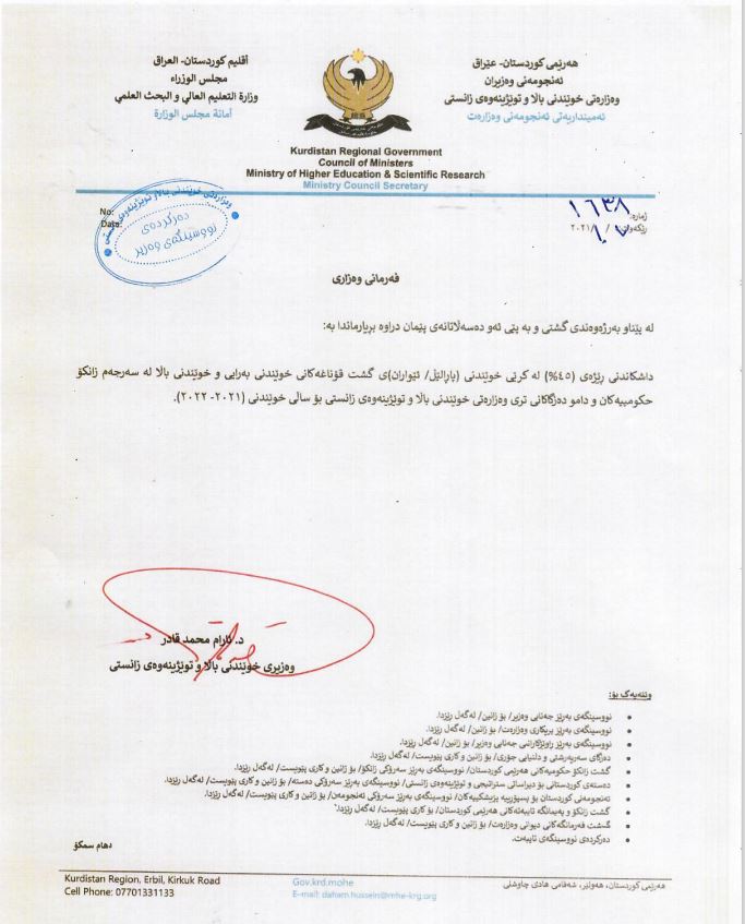 داشکانى رێژەى45% لە کرێى خوێندنى (پارالێل) و (ئێواران)ـى گشت قۆناخەکانى خوێندنى بەرایى و خوێندنى باڵا لە سەرجەم زانکۆ حکومییەکان و دامودەزگەکانى دیکەی وەزارەتى خوێندنى باڵا و توێژینەوەى زانستى بۆ ساڵى خوێندنى 2021 - 2022