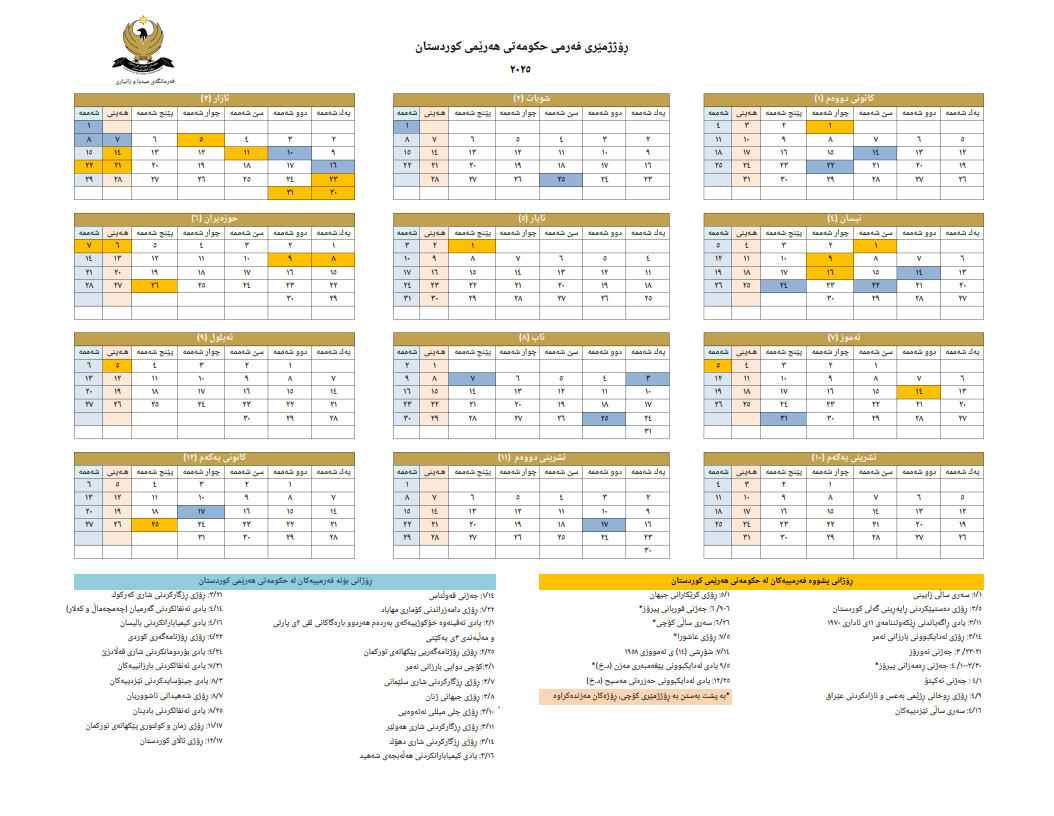 حکومەتی هەرێمی کوردستان ساڵانە خشتەی پشووە فەرمییەکان بڵاودەکاتەوە و بەشێکیان بەسەر بۆنەکاندا دابەشبوون.