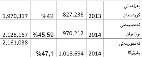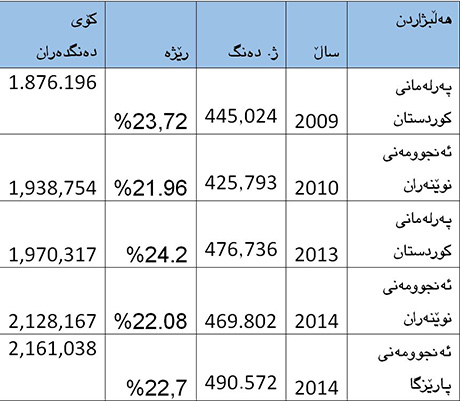 كەمترینی دەنگ و رێژەی لە هەڵبژاردنی ئەنجومەنی نوێنەرانی عێراق ساڵی 2010 یە كە (425.793) دەنگە بەڕێژەی 21.96%. زۆرترین دەنگیش هەڵبژاردنی پارێزگاكانی ساڵی 2014 یە كە (64.779) دەنگ زیاترە لەكەمترین ئاستی دەنگی و دەنگەكانی بۆ (490.572) هەڵكشاوە. بەرزترین ئاستی رێژەی لە هەڵبژاردنی پەرلەمانی كوردستان لە ساڵی 2013یە كە 24.2%.