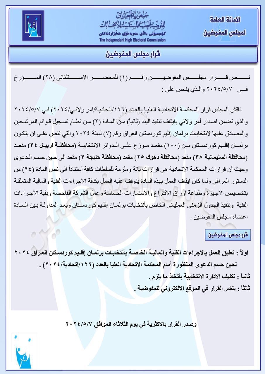 رۆژی چوارشەممە 8ی ئایاری 2024 جومانە غەلای، گوتەبێژی کۆمیسیۆنی باڵای سەربەخۆی هەڵبژاردنەکانی عێراق بە رووداوی گوت، "دوای بڕیارەکەی دادگەی باڵای فیدراڵی، دوێنێ سێشەممە 7ی ئایاری 2024 ئەنجوومەنی کۆمیسیارانی کۆمیسیۆنی باڵای سەربەخۆی هەڵبژاردنەکانی عێراق بڕیاری دا سەرجەم رێکارە تەکنیکی و داراییەکانی تایبەت بە هەڵبژاردنی پەرلەمانی کوردستان رابگرێت، تاوەکو ئەو سکاڵایە یەکلا دەبێتەوە کە لە دادگەی باڵای فیدراڵی تۆمار کراوە."