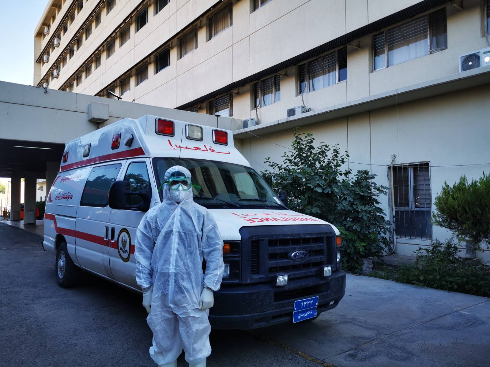 کارمەندێکی تەندروستی لە بەردەم ئەمبوڵانسێک لە نەخۆشخانەی رزگاری لە هەولێر. وێنە: مەهدی فەرەج - رووداو