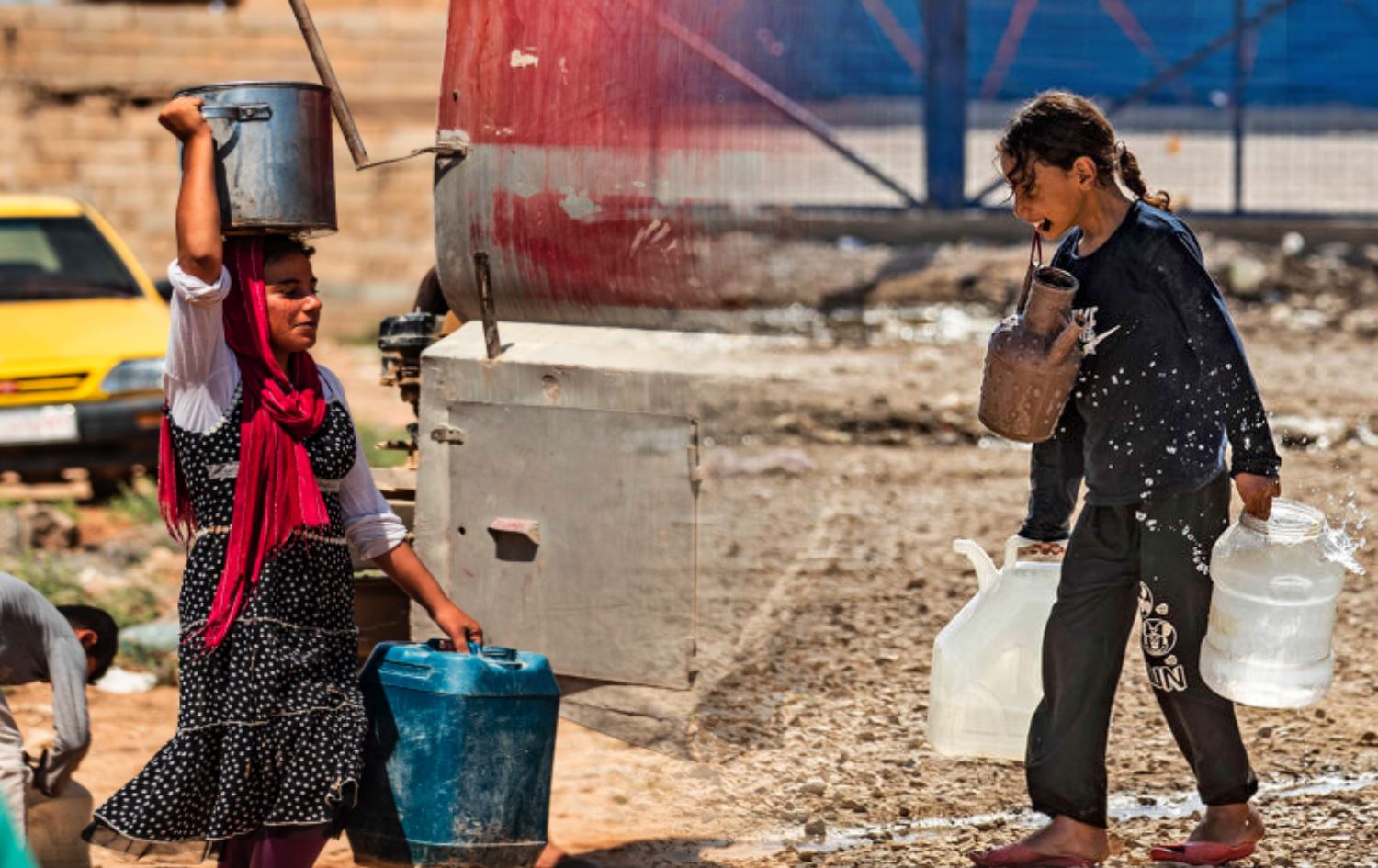 کچێک لە کەمپێکی نزیک حەسەکە بە هەردوو دەست و دەمیشی ئاوی دەباتەوە بۆ ماڵەوە. وێنە: Delil Souleiman/AFP via Getty Images