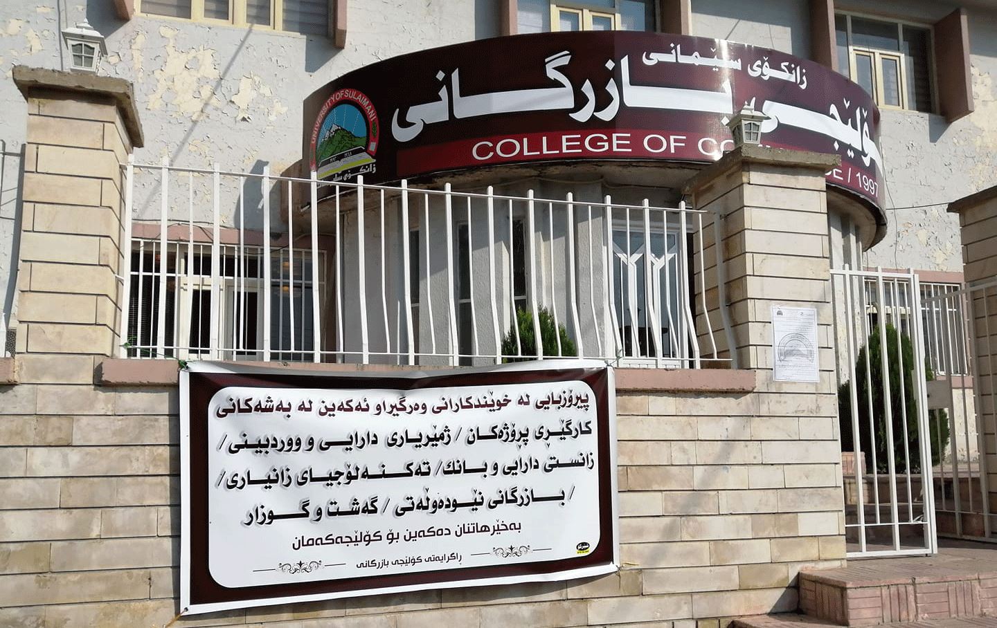 کۆلێژی بازرگانیی زانکۆی سلێمانی لە شەش بەش پێکهاتووە کە بریتین لە: کارگێڕی، ژمێریاریی، دارایی و بانک، گەشتوگوزار، تەکنەلۆژیای زانیاریی IT و بازرگانیی نێودەوڵەتی. بەگوتەی راگری کۆلێژ ژمارەیان زیاترە لە 2000 خوێندکار، بەڵام تەنیا 160 خوێندکاریان لەنێو بەشە ناوخۆییەکان دەمێننەوە. " سەرپشکیش کراون کە بێنە زانکۆ یاخود بە ئەلیکترۆنی وانەکانیان بخوێنن."