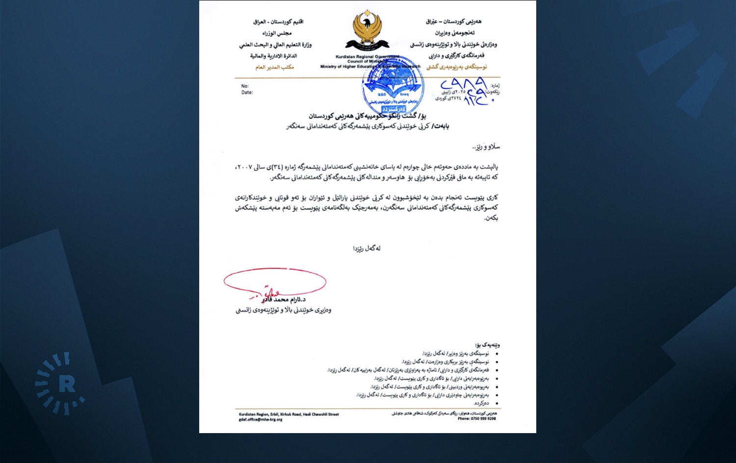 لە گشتاندنێکدا کە ئەمڕۆ یەکشەممە، 09-02-2025، بۆ تەواوی زانکۆکانی ناردووە، د. ئارام محەممەد قادر، وەزیری خوێندنی باڵای هەرێمی کوردستان بڕیاری داوە "بە لێخۆشبوون لە کرێى خوێندنى پارالێل و ئێواران بۆ ئەو قوتابى و خوێندکارانەى کەسوکارى پێشمەرگەکانى کەمئەندامانى سەنگەرن".