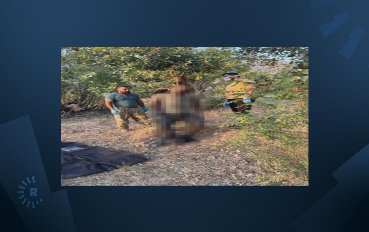 تەرمی ئەو گەنجە کە لەسەر جەستەی دیارە ئەشکەنجە دراوە و دەستی لە دواوە بەسترابووەوە بە دارێکەوە هەڵواسرابوو.