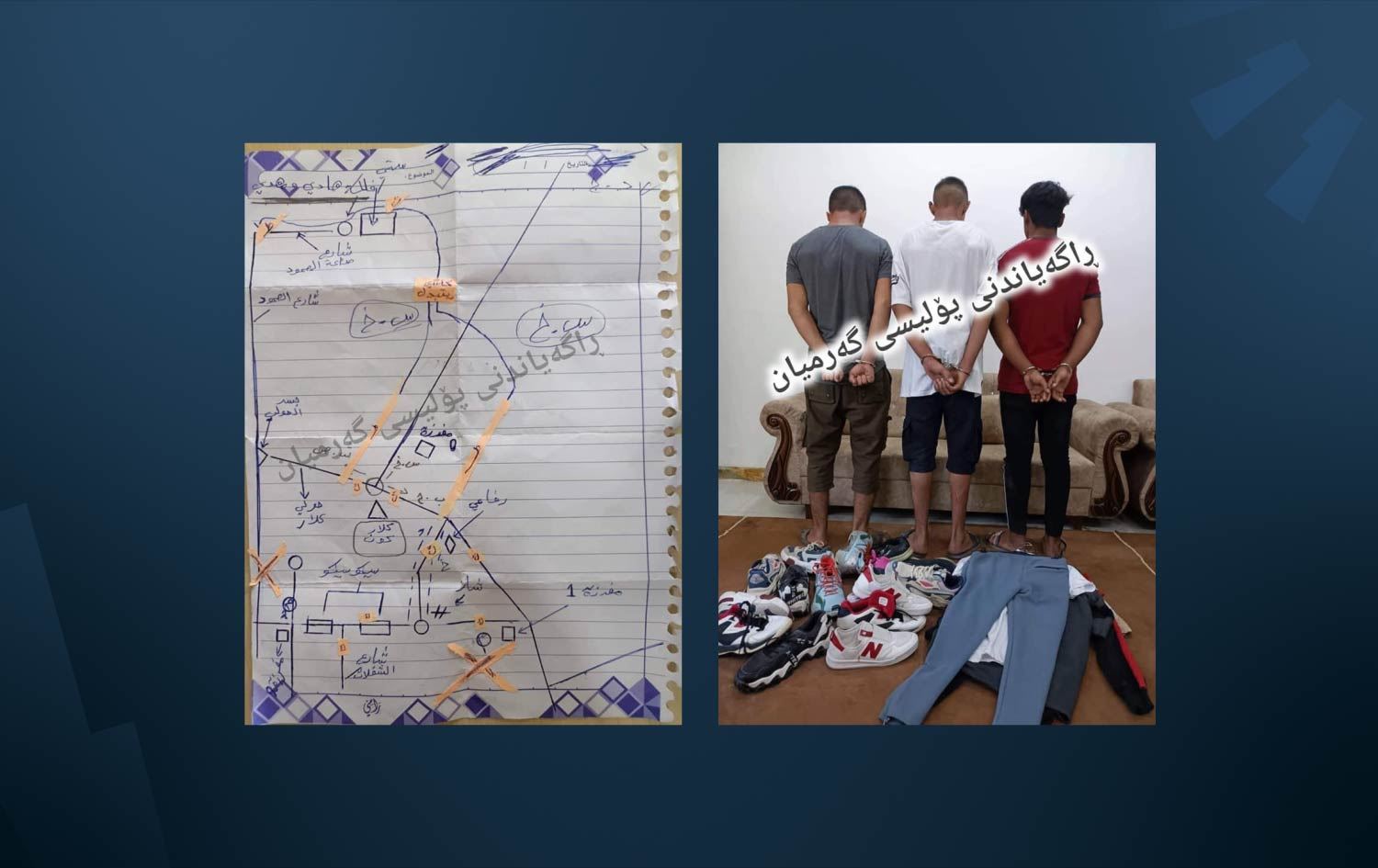 پۆلیسی گەرمیان رایدەگەیێنێت کە سێ کەسیان لەسەر دانانی پلانی پێشوەختەی دزیکردن دەستگیرکردووە کە لەسەر کاخەزێک پلانەکەیان داڕشتووە و نەخشەی کەلاریان کێشاوە.