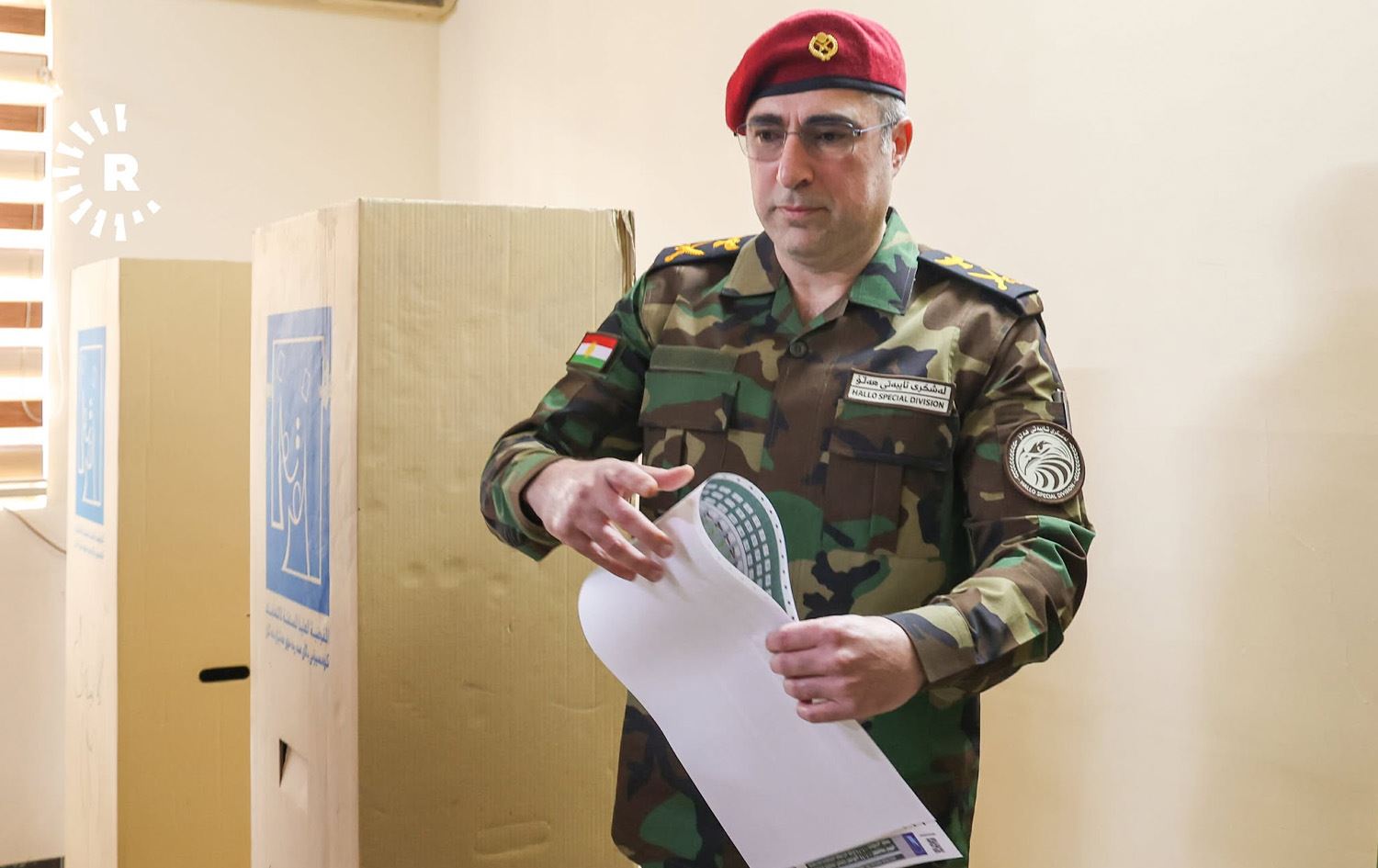 رەوان ئیدریس بارزانی، فەرماندەی لەشکری تایبەتی هەڵۆ لە بنکەیەکی دەنگدان لە هەولێر دەنگیدا. وێنە: بڵند تاهیر - رووداو