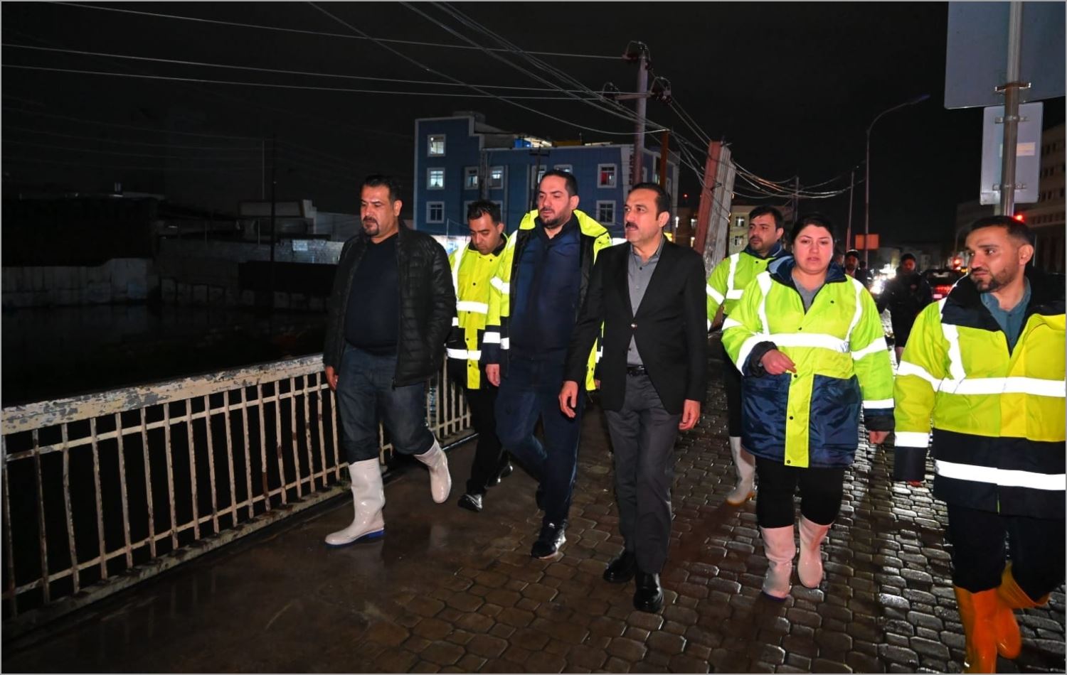 ئومێد خۆشناو شەوی رابردوو لەکاتی بەسەرکردنەوەی شوێنەکانی پەنگخواردنەوەی ئاوی باران، وێنە: پەیجی فەیسبووکی پارێزگای هەولێر