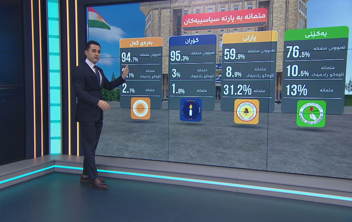 بەشێکی بەرفراوانی راپرسییەکە تایبەتە بە کەمبوونەوەی متمانەی هاونیشتمانییان بە لایەنە سیاسییەکانی هەرێمی کوردستان لەدوای هەڵبژاردنی خوولی شەشی پەرلەمانی کوردستان کە مانگی تشرینی دووەمی 2024 ئەنجامدرا و لەو راپرسییەدا دەردەکەوێت دوای شەش مانگ لە ئەنجامدانی هەڵبژاردن متمانەی هاونیشتمانییان بە لایەنە سیاسییەکان کەمبووەتەوە بە رێژەی جیاواز بەجۆرێک:-