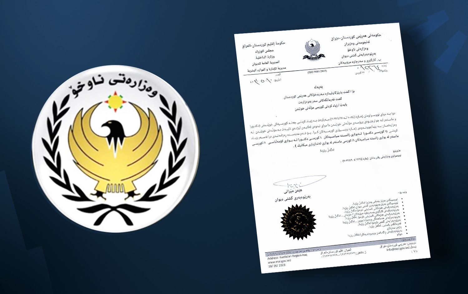 بەپێی نووسراوێکی وەزارەتی ناوخۆ بە ژمارە (12364) کە رۆژی چوارشەممە 10-05-2023 بە واژۆی هێمن میرانی، بەڕێوەبەری گشتیی دیوانی وەزارەت دەرچووە و تایبەتە بە زیادکردنی چەند کورسییەکی خوێندنی (دکتۆرا و ماستەر) لە چوارچێوەی پڕۆسەی مۆڵەتی خوێندن، دوای ئەوەی لەلایەن لیژنەی تایبەت بە مۆڵەتی خوێندن لە وەزارەت، پێداچوونەوە بە ژمارە و پسپۆڕیی کورسییەکان کرا، رەزامەندی درا لەسەر زیادکردنی دوو کورسیی ماستەر و دوو کورسیی دکتۆرا.