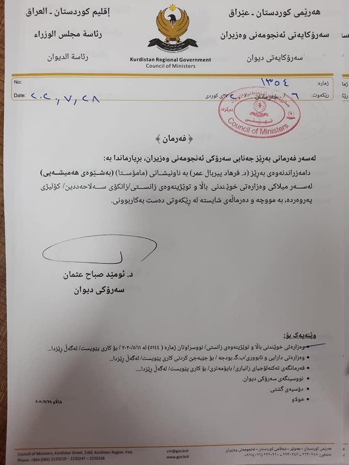 د. فەرهاد پیرباڵ رایدەگەیێنێت، بە فەرمانی سەرۆکوەزیرانی هەرێمی کوردستان دەگەڕێتەوە زانکۆی سەلاحەددین. سەرۆکی زانکۆکەش دەڵێت، پێشوازی لە گەڕانەوەی دەکەن.