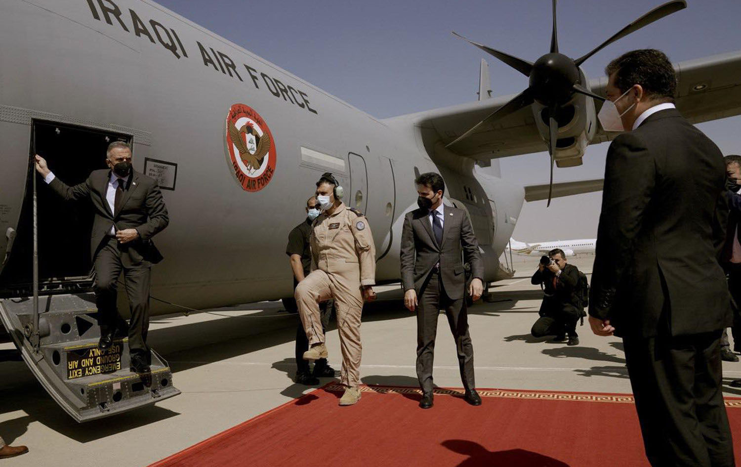 ساتی گەیشتنی مستەفا کازمی بۆ فڕۆکەخانەی هەولێر. وێنە: نووسینگەی راگەیاندنی سەرۆکوەزیرانی عێراق