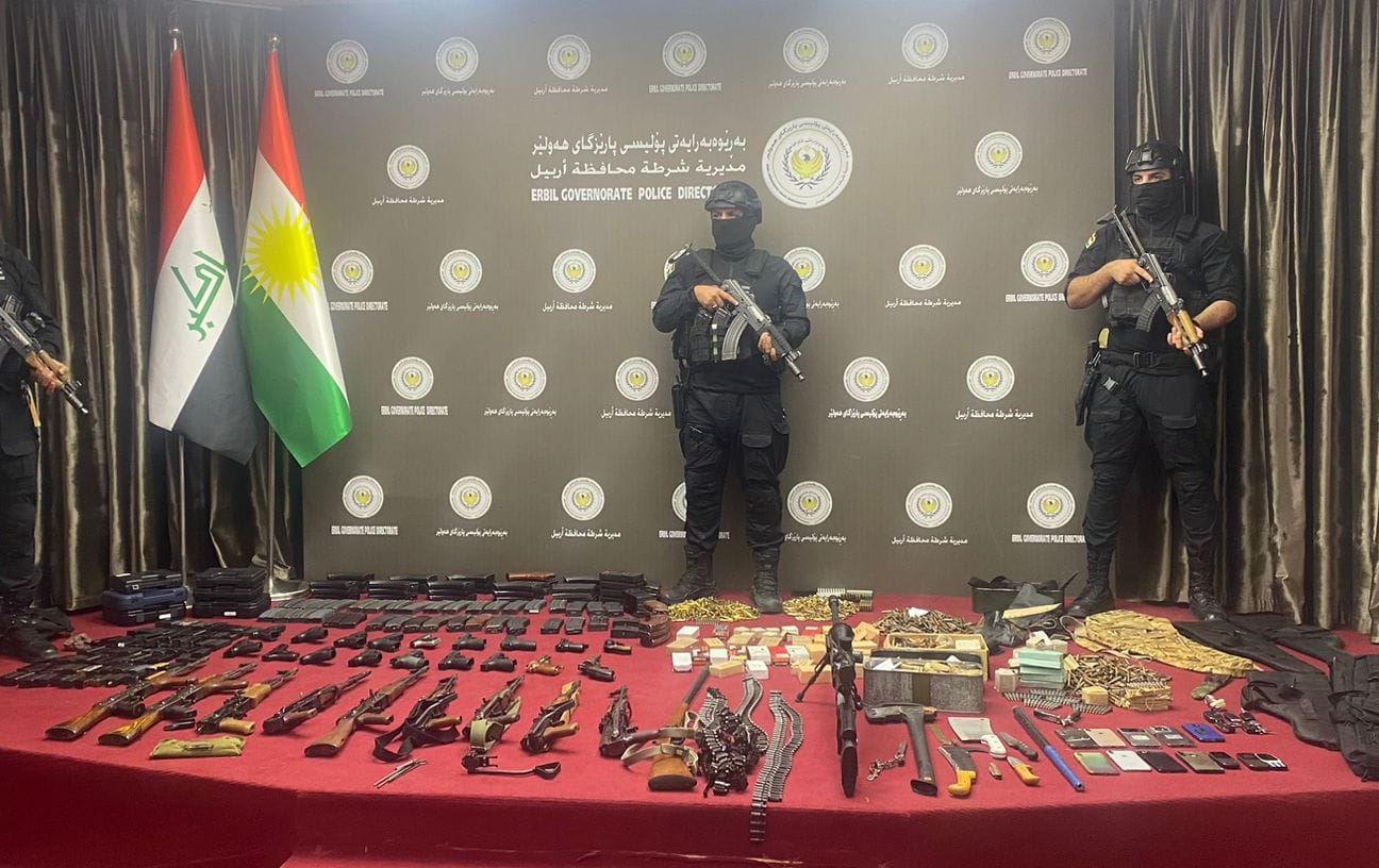 پۆلیسی هەولێر ئاماژەی بەوە کردووە، "توانیمان دەست بەسەر چەندین جۆر پارچە چەکدا بگرین، لەوانە یەک نیشانەشکێن (قەناس)، 18 دەمانچە، نۆ کڵاشینکۆڤ، 174 مەخزەنی چەک و زیاتر لە شەش هەزار فیشەکی جۆراوجۆر لەگەڵ چەندین کەلوپەلی سەربازی و ژمارەیەک ئۆتۆمبێل.