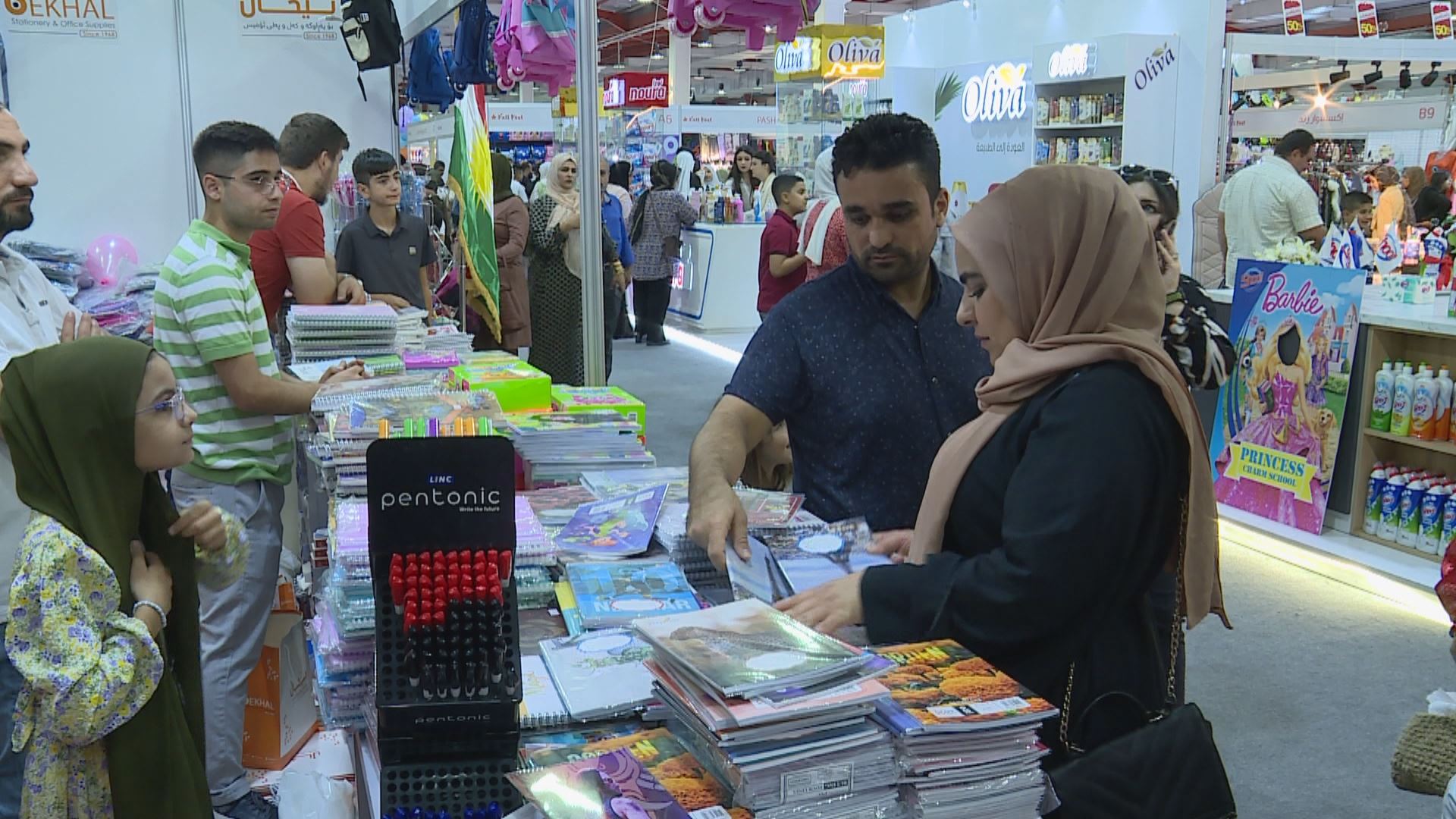 سەرجەم پێداویستییەکانی خوێندن لە پێشانگەکەدا خراونەتەڕوو؛ منداڵان بەدوای کەلوپەلێکی جواندا بۆ وەرزی تازەی خوێندن و دایک و باوکانیش بەدوای نرخێکی باشدا دەگەڕێن.