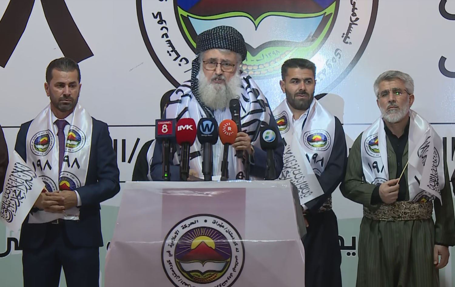 عیرفان عەبدولعەزیز، رابەری بزووتنەوەی ئیسلامیی کوردستان لەکاتی بانگەشەی حیزبەکەیدا گوتار دەدات