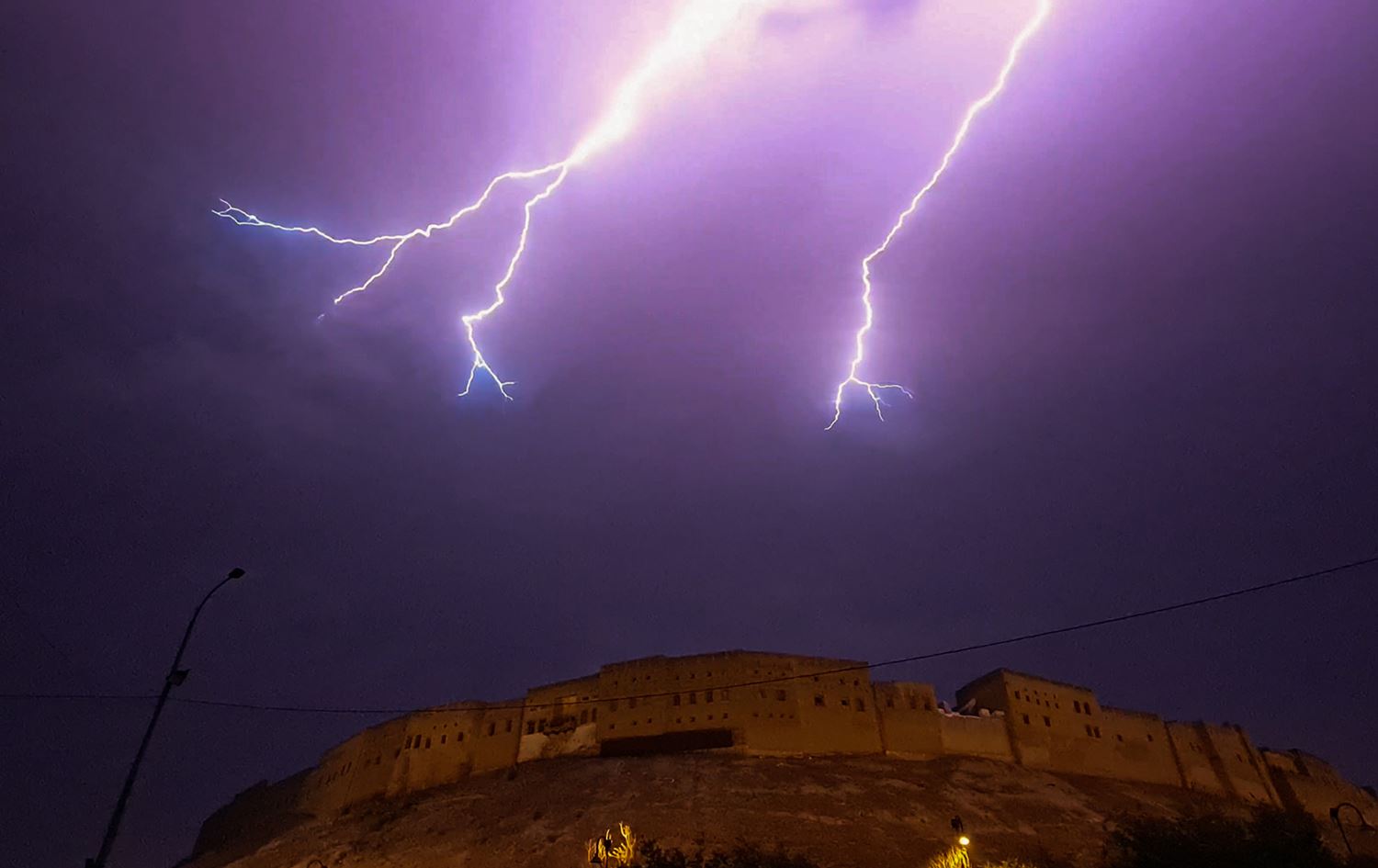 هەورەبرووسکە لە ئاسمانی هەولێر کە بەشێک لە قەڵای شارەکەش دیارە، دەردەکەوێت. وێنە: بڵند تاهیر - رووداو