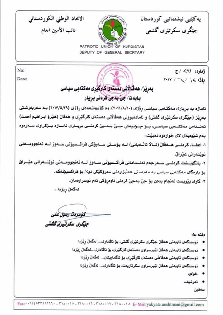 لە نووسراوەکەدا ئاماژە بەوە کراوە لە کۆبوونەوەی مەکتەبی سیاسی یەکێتی لە 29-5-2017 بە ئامادەبوونی کۆسرەت رەسول جێگری سکرتێری گشتی یەکێتی و هێرۆ ئیبراهیم ئەحمەد، ئەندامی مەکتەبی سیاسی یەکێتی نیشتمانی کوردستان بڕیاردرا بە "ئیعفاکردنی" ئاڵا تاڵەبانی لە پۆستی سەرۆکی فراکسیۆنی یەکێتی نیشتمانی کوردستان.