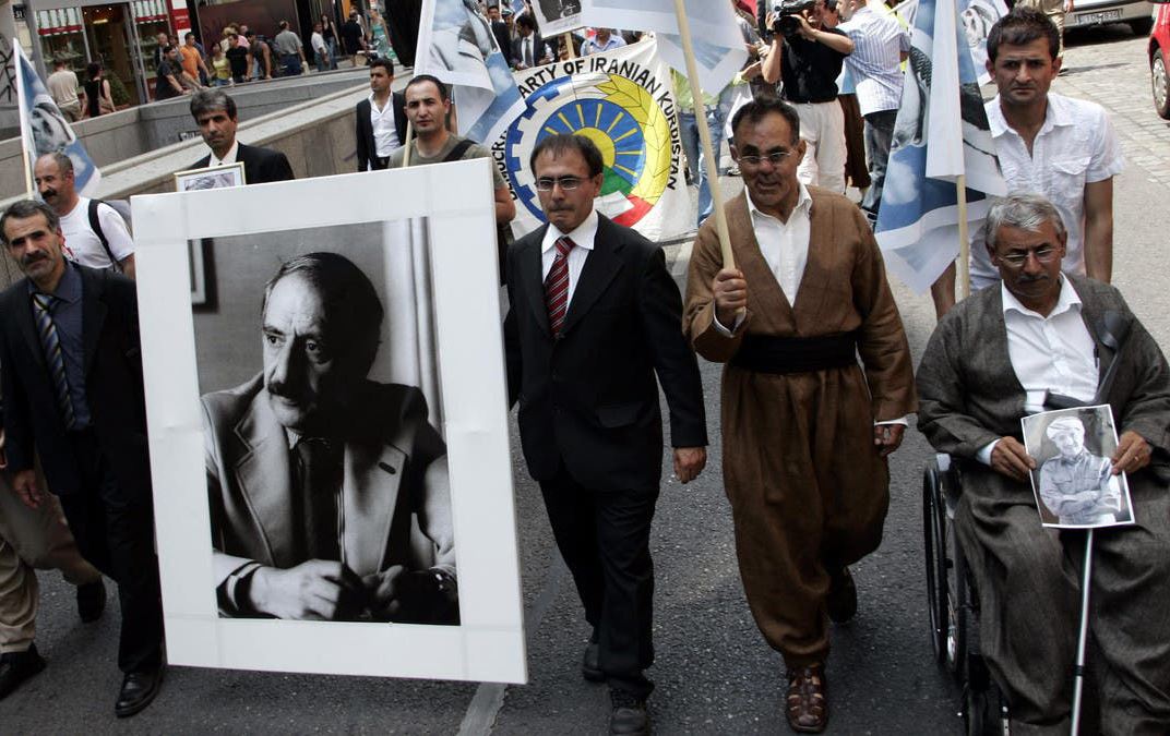 ژمارەیەک کوردی دانیشتووی ڤیەننا لە ساڵڕۆژی تیرۆکردنی قاسملوو رێپێوانێک دەکەن. 13-7-2006. وێنە: AFP