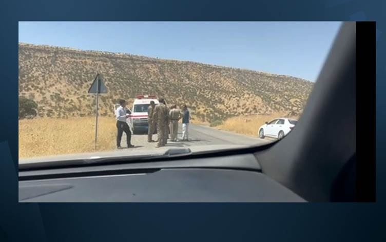 ئەمبیوڵانسێک و ژمارەیەک ئەندامی هێزی ئەمنی لەسەر رێگەی گوندێکی ئاخجەلەر دوای بۆردوومانێک کە قوربانیی لێ کەوتەوە لە 6ـی ئابی 2023