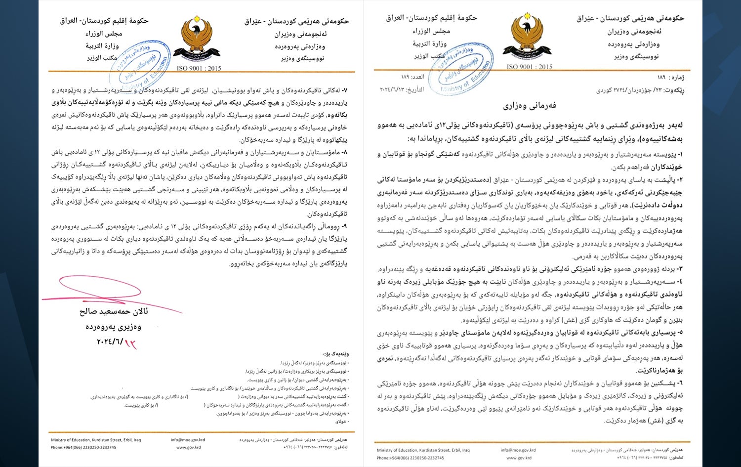 وەزارەتی پەروەردە دەڵێت، "پێویستە سەرپەرشتیار، بەڕێوەبەر و یاریدەدر چاودێریی هۆڵەکانی خوێندن بکەن و کەشێکی گونجاو بۆ قوتابییان و خویندکاران دابین بکەن".