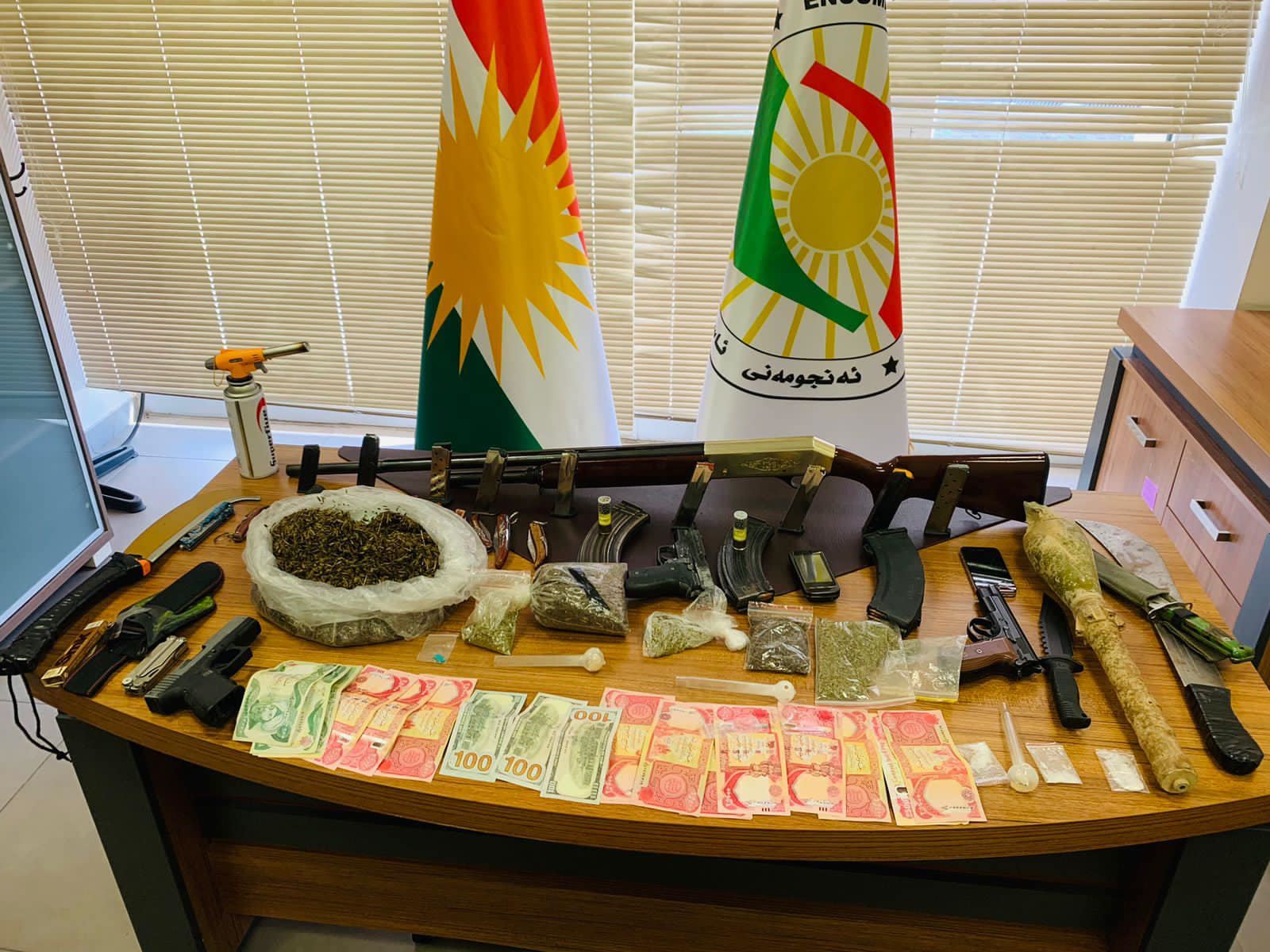 لە وێنەیەکەی ئاسایشی هەرێمی کوردستاندا چەند پارچە چەکێک دەردەکەوێت کە پێکهاتوون لە (دەمانچە و گوللـە ئاڕپیجی، چەند چەقۆیەکی گەورە و بچووک).