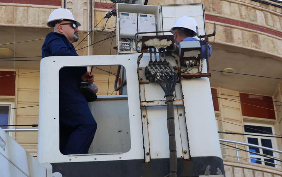 دوو کارمەندی وەزارەتی کارەبا لە کاتی لابردنی سەرپێچییەکانی کارەبا لە گەڕەکی وەزیرانی هەولێر. وێنە: وەزارەتی کارەبا