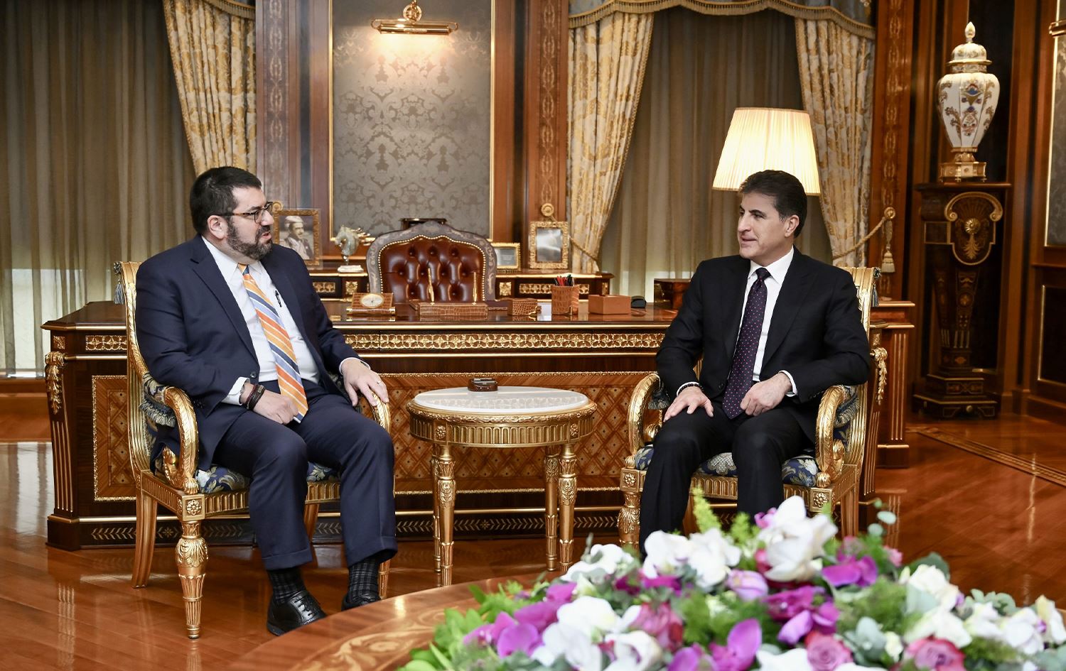 ئەمڕۆ چوارشەممە، 14-02-2024، نێچیرڤان بارزانی، سەرۆکی هەرێمی کوردستان لەگەڵ دهيڤد بێرگهر، ههڵسووڕێنهرى كاروبارى باڵيۆزخانهى ئهمريكا له عێراق كۆبووهوه.