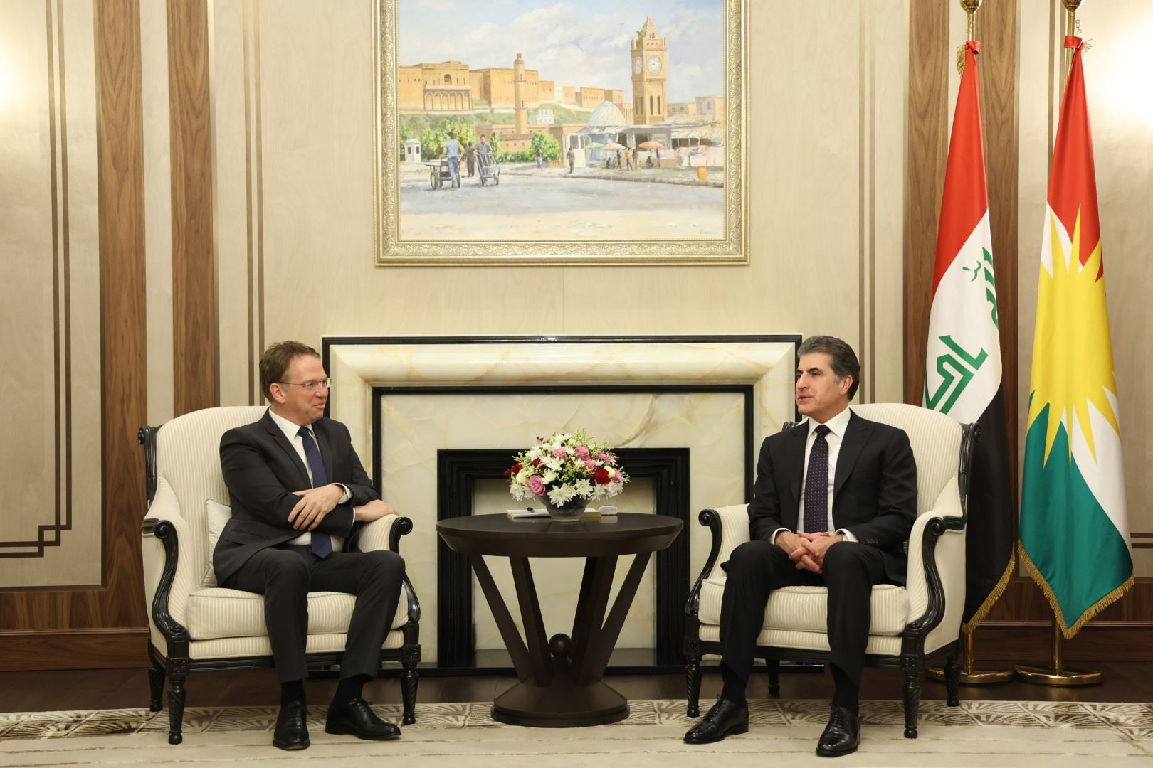 نێچیرڤان بارزانی، سەرۆکی هەرێمی کوردستان، پێشوازی لە پاتریک دۆرێل، باڵیۆزی فەرەنسا لە عێراق کرد.