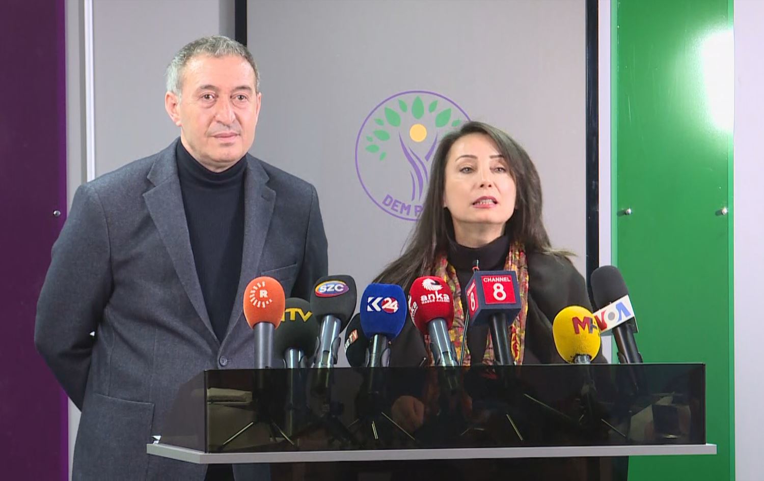 تولای هاتیمئۆغوڵڵاری و تونجەر باکرهان، هاوسەرۆکانی پارتی یەکسانی و دیموکراسیی گەلان (دەم پارتی)، رۆژی شەممە، 15ی شوباتی 2025، لە ئەنقەرە کۆنفرانسێکی رۆژنامەڤانییان سازکرد.