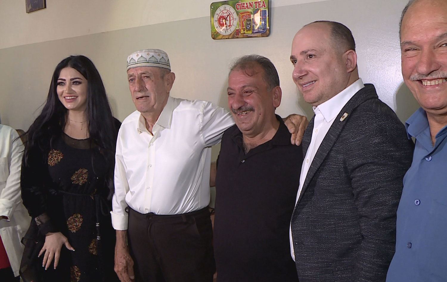 هونهرمهندانى سلێمانى ههریهكه و به گوڵێك باوەشى وهفا به چاوشندا دهكەن و ئهویش پێكهنین و فرمێسكى تێكهڵ به یهككردووه، كاتێك چاوى به هاوڕێ دێرینهكانى خۆیكهوت.
