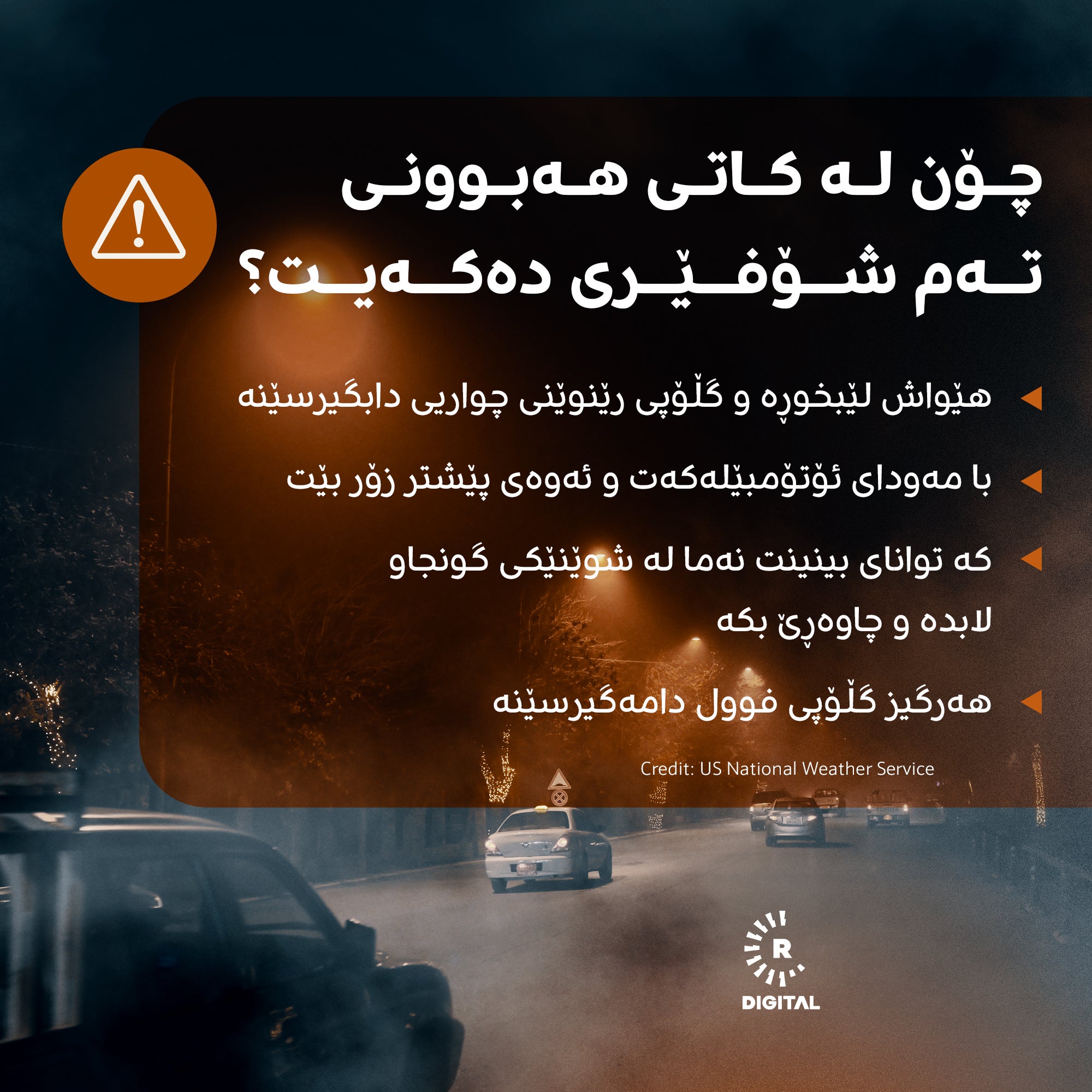 بەڕێوەبەرایەتیی هاتووچۆی سلێمانیش سێ رێنوێنی دەداتە شۆفێران بۆ جێبەجێکردنیان لە کاتی شۆفێریکردندا لە کەشوهەوای تەماویدا: