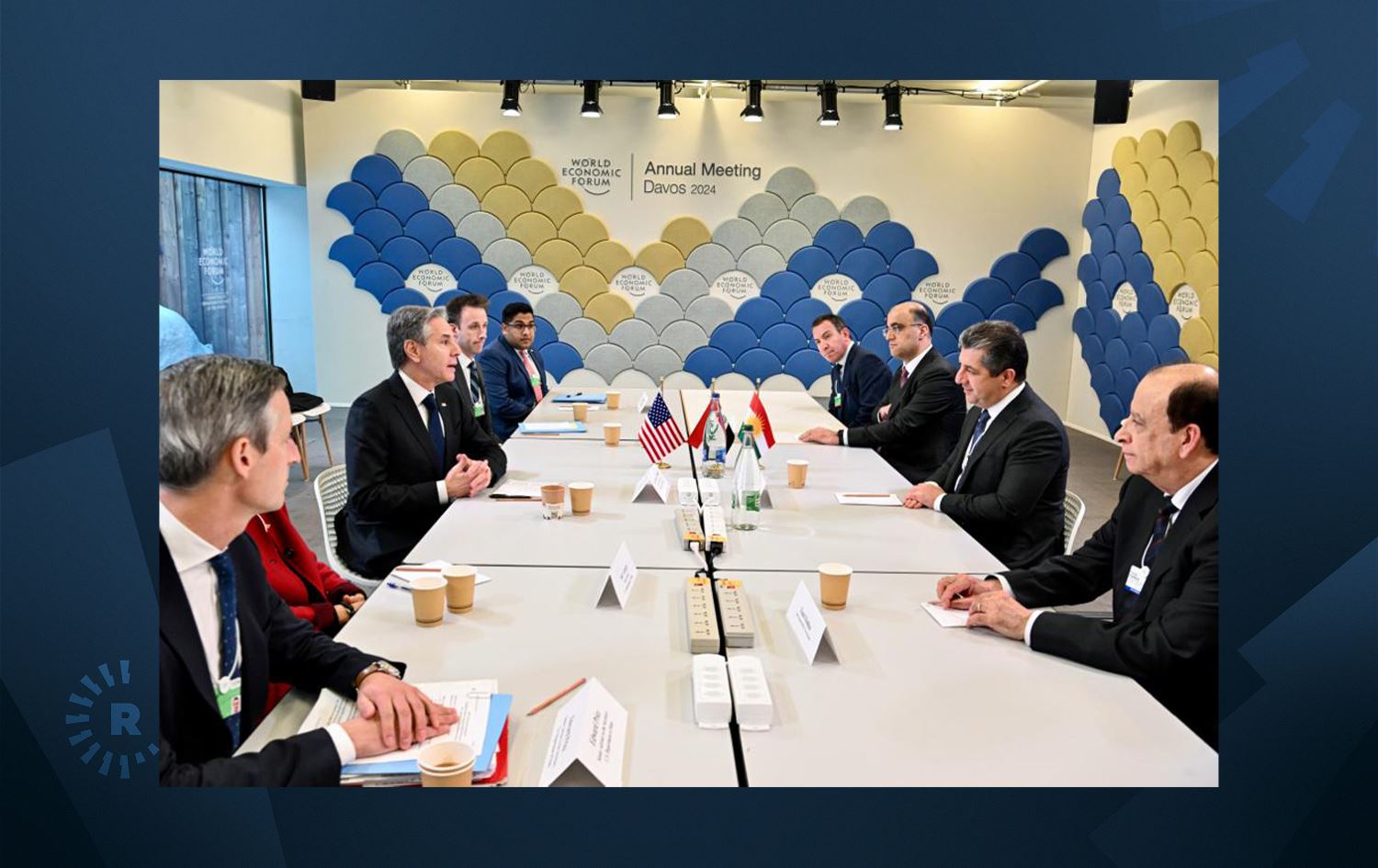 کۆبوونەوەی مەسرور بارزانی، سەرۆکوەزیرانی هەرێمی کوردستان و ئەنتۆنی بلینکن، وەزیری دەرەوەی ئەمریکا لە داڤۆس، رۆژی 16-1-2024. وێنە: KRG